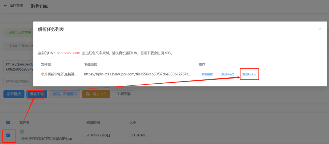 然后等待解析結果,點擊發(fā)送【Motrix】。
