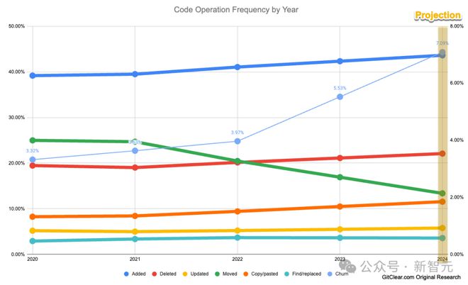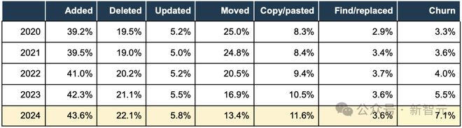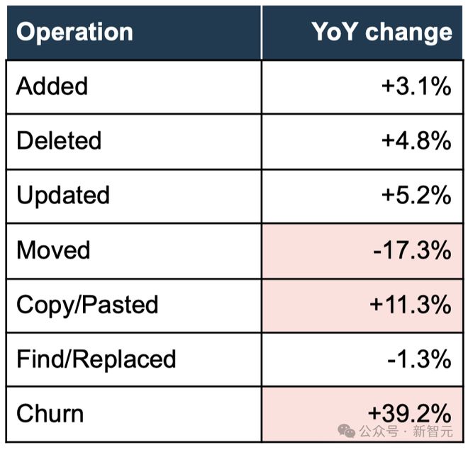 而老鳥們深知,隨著時間推移,代碼的維護成本會越來越高。 代碼操作介紹 GitClear 將代碼變更分為七個類別(研究中涉及前六種): 1. 新增代碼:首次提交的代碼行,代碼行是全新的,不包括對現(xiàn)有代碼行的小幅修改,也不包括那些被添加、移除后又重新添加的代碼行。 2. 刪除代碼:被刪除并提交的代碼行,且至少在隨后的兩周內(nèi)未被重新加入。 3. 移動代碼:將一行代碼剪切并粘貼到新文件或同一文件內(nèi)的新函數(shù)中?!敢苿印沟牟僮鲀H涉及位置的變換,代碼內(nèi)容不發(fā)生改變。 4. 更新代碼:修改大約三個或更少的單詞來更改原有代碼行。 5. 查找/替換代碼:從三個或更多位置移除相同字符串,并用一致的內(nèi)容進行替換。 6. 復(fù)制/粘貼代碼:在一次提交中,將相同的代碼行內(nèi)容復(fù)制到多個文件或函數(shù)中。 7. 無操作代碼:指一些微小的代碼變更,比如空格或同一代碼塊內(nèi)行號的變化。 GitClear 自 2020 年起根據(jù)這些操作對 git 倉庫進行分類,并在 Diff Delta 文檔中提供了代碼操作的具體示例。 截至 2024 年 1 月,GitClear 分析并分類了大約十億行代碼,這些代碼來自商業(yè)客戶(如 NextGen Health, Verizon)和流行的開源倉庫(如 Facebook React, Google Chrome)。 其中,1.53 億行代碼為有意義的變更,被用于本研究。 最后,還有一個單獨的定義叫做「攪動」(churn),意思是代碼被創(chuàng)建、推送到 git 倉庫后,在接下來的兩周內(nèi)被撤銷或大幅修改。 ——也就是咱們最開始分析的那張圖,可以將「攪動」理解為,作者一開始編寫、提交并推送到公司 git 倉庫的代碼有問題,后來發(fā)現(xiàn)了。 數(shù)據(jù)分析 下表根據(jù) GitClear 的數(shù)據(jù),分析了不同的代碼行操作數(shù)量,并按照代碼的編寫年份進行分類。 表中的前六項就是上面提到的代碼變更的前六個類別,而最后一項是「攪動」。