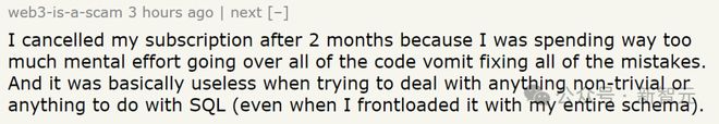 單個開發(fā)者的情況可能無法說明為何「代碼質(zhì)量」和「生產(chǎn)環(huán)境中的問題事件」在使用 AI 時顯得更加重要,但報告的數(shù)據(jù)揭示了一個可能的原因: 當開發(fā)者被一波又一波看似合適、能短期內(nèi)解決問題的建議所淹沒時,他們很容易不斷增加代碼量,卻忽視了代碼的優(yōu)化和復(fù)用。 ——如果按一下 Tab 鍵就能解決當前的問題,為什么要費心思管以后的事情? AI 助手和 Copilot 將如何重塑開發(fā)者的角色?隨著 AI 技術(shù)的廣泛應(yīng)用,毫無疑問,我們已經(jīng)進入了一個代碼增長速度空前的新時代。 那么,2024 年的問題可能是:誰來收拾事后的爛攤子? 網(wǎng)友討論 面對 AI 帶來的「全球代碼質(zhì)量下行」,網(wǎng)友也是深有體會: 譴責型:「我在兩個月后取消了訂閱(Copilot),因為我花了太多精力去修復(fù)所有代碼錯誤。而且在處理任何復(fù)雜的事情或與 SQL 有關(guān)的事情時,它基本上是無用的(即使我提前加載了整個模式)?!?/p>