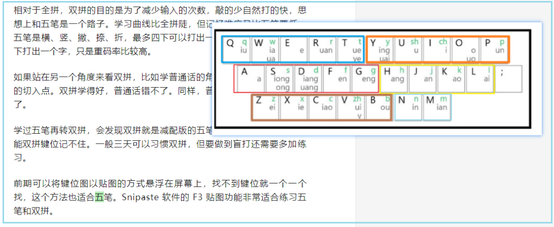 相對(duì)于全拼,雙拼的目的是為了減少輸入的次數(shù),敲的少自然打的快,思想上和五筆是一個(gè)路子。學(xué)習(xí)曲線比全拼陡,但記憶難度又比五筆要低。五筆是橫、豎、撇、捺、折,最多四下可以打出一個(gè)字。雙拼可以做到兩下打出一個(gè)字,只是重碼率比較高。 如果站在另一個(gè)角度來(lái)看雙拼,比如學(xué)普通話(huà)的角度,雙拼是一個(gè)比較好的切入點(diǎn)。雙拼學(xué)得好,普通話(huà)錯(cuò)不了。同樣,普通話(huà)說(shuō)得好,雙拼是個(gè)寶。 學(xué)過(guò)五筆再轉(zhuǎn)雙拼,會(huì)發(fā)現(xiàn)雙拼就是減配版的五筆。字根都記住了,不可能雙拼鍵位記不住。一般三天可以習(xí)慣雙拼,但要做到盲打還需要多加練習(xí)。 前期可以將鍵位圖以貼圖的方式懸浮在屏幕上,找不到鍵位就一個(gè)一個(gè)找,這個(gè)方法也適合五筆。Snipaste 軟件的 F3 貼圖功能非常適合練習(xí)五筆和雙拼,類(lèi)似這樣: