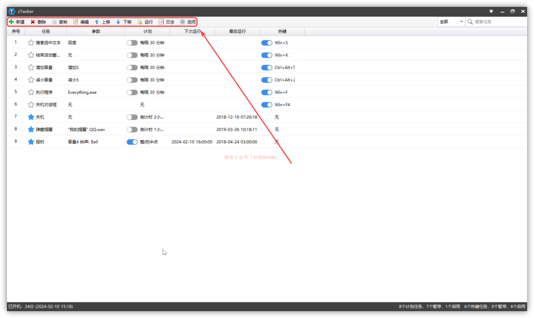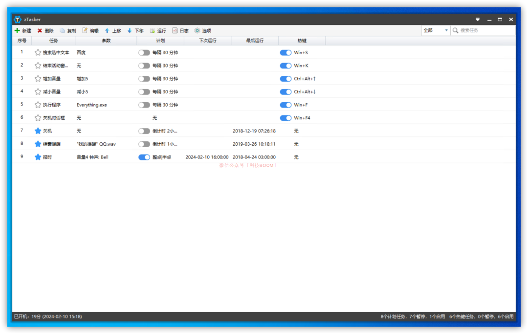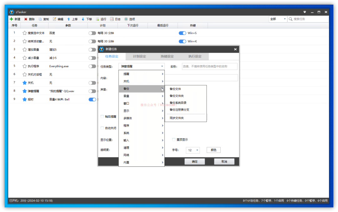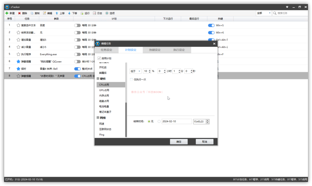 zTasker 是一款免費無廣告的,功能極其強大的定時/熱鍵自動化任務(wù)工具,可以通過定時或熱鍵的方式執(zhí)行多種自動化任務(wù)。它大小在 7MB 左右,目前僅支持 Windows 平臺。它資源占用低,內(nèi)置了提醒、窗口操作、打開/關(guān)閉程序、開/關(guān)機、發(fā)送按鍵等100+種任務(wù)類型,20+種定時/條件執(zhí)行方法。任務(wù)列表支持隨意編輯、排列、移動、更改類型,支持任務(wù)執(zhí)行日志、任務(wù)列表等數(shù)據(jù)的自動備份和更新。它功能非常強大,我們可以理解為 zTasker 是 Windows「任務(wù)計劃程序」的強化版。通過軟件上方的菜單,我們可以給它添加各類任務(wù),讓電腦在某一條件下(時間、快捷鍵等)自動執(zhí)行各類任務(wù):它內(nèi)置的自動化任務(wù)的觸發(fā)方式也有很多種,自定義程度非常高。設(shè)置好需要執(zhí)行的任務(wù)后,切換到【計劃設(shè)定】界面就可以自定義觸發(fā)方式,如電池電量降到某值時執(zhí)行任務(wù)、CPU 占用率降到某值執(zhí)行任務(wù)等等:如果大家之前用過 iOS、安卓設(shè)備上的快捷指令、自動化等功能的話,相信對這些設(shè)置并不陌生。使用時有一點需要大家注意:使用它創(chuàng)建的自動化任務(wù)正常運行的前提條件是,它能正常運行。因此,我們在使用時需允許它開機自啟動。