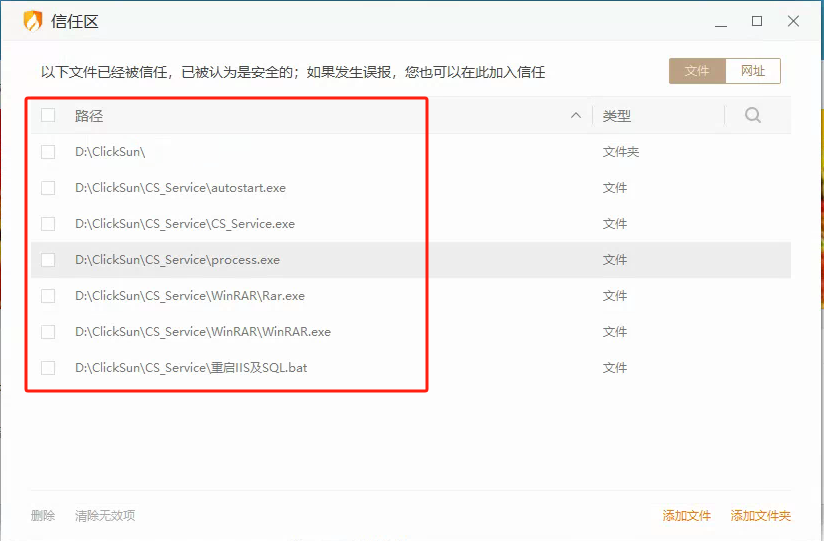 加入時,注意有6個程序和1個目錄務(wù)必加入: 1個目錄:D:\ClickSun\ 6個程序:D:\ClickSun\CS_Service\CS_Service.exe、D:\ClickSun\CS_Service\process.exe、D:\ClickSun\CS_Service\autostart.exe、D:\ClickSun\CS_Service\WinRAR\Rar.exe、D:\ClickSun\CS_Service\WinRAR\WinRAR.exe、D:\ClickSun\Files\Tools\office2pdf.exe 如果安裝了KLS自動同步備份程序,那么也要將KLS的相關(guān)程序加進(jìn)去:klsbackup.exe、klsbjob.exe、klsbsched.exe、klsbservice.exe、klsexec.exe、klsoptdt.exe。