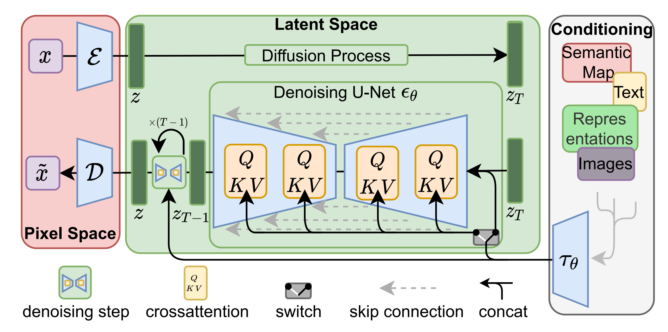 你會(huì)發(fā)現(xiàn),上述整個(gè)過(guò)程,其實(shí)和SD的原理是有較大的相似性(SD原理詳見(jiàn)此文《從CLIP到DALLE1/2、DALLE 3、Stable Diffusion、SDXL Turbo、LCM》的3.2節(jié)),當(dāng)然,不同之處也有很多,比如視頻需要一次性還原多幀、圖像只需要還原一幀