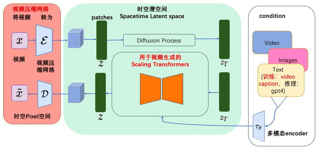 1 擴(kuò)散時(shí)卷積結(jié)構(gòu)U-net被替換成了transformer結(jié)構(gòu)的DiT(加之視覺(jué)元素轉(zhuǎn)換成token之后,transformer擅長(zhǎng)長(zhǎng)距離建模,下文詳述DiT)