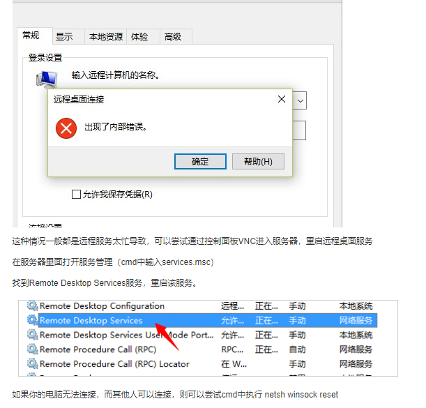 1、遠(yuǎn)程桌面出現(xiàn)內(nèi)部錯誤