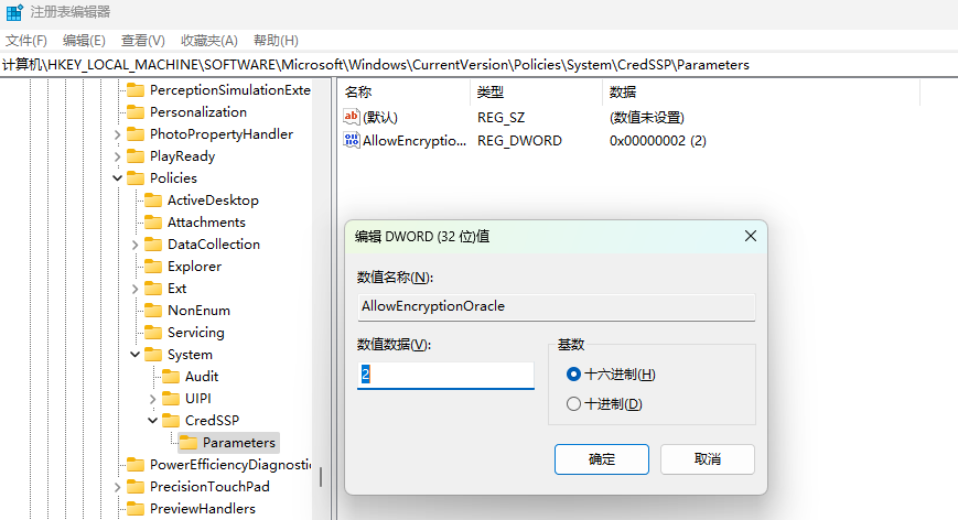 5、在Parameters 里(右側(cè)) 單擊右鍵,新建—> DWORD(32位),重命名為:“AllowEncryptionOracle",值:2