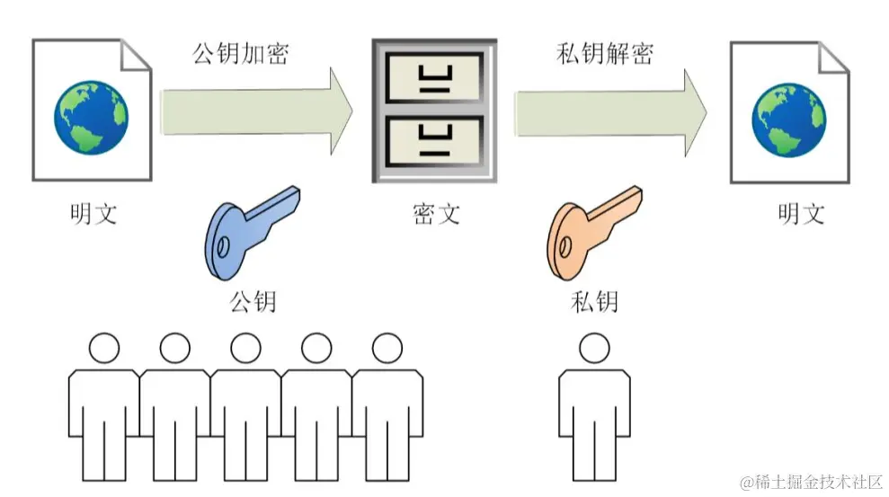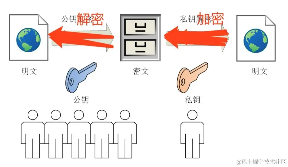 非對稱加密有兩個密鑰,一個公鑰一個私鑰。公鑰是公開的,供多個人使用;私鑰是非公開的,僅一個人或者少數(shù)群體使用。當(dāng)非對稱加密算法用作加解密時,公鑰用來對明文加密,私鑰用來給密文解密,這個順序不能顛倒。你可以這樣理解,密文是私密的東西,只有少數(shù)人才能解密,所以少數(shù)人手里的私鑰用來解密,多數(shù)人手里的公鑰不能解密只能加密。