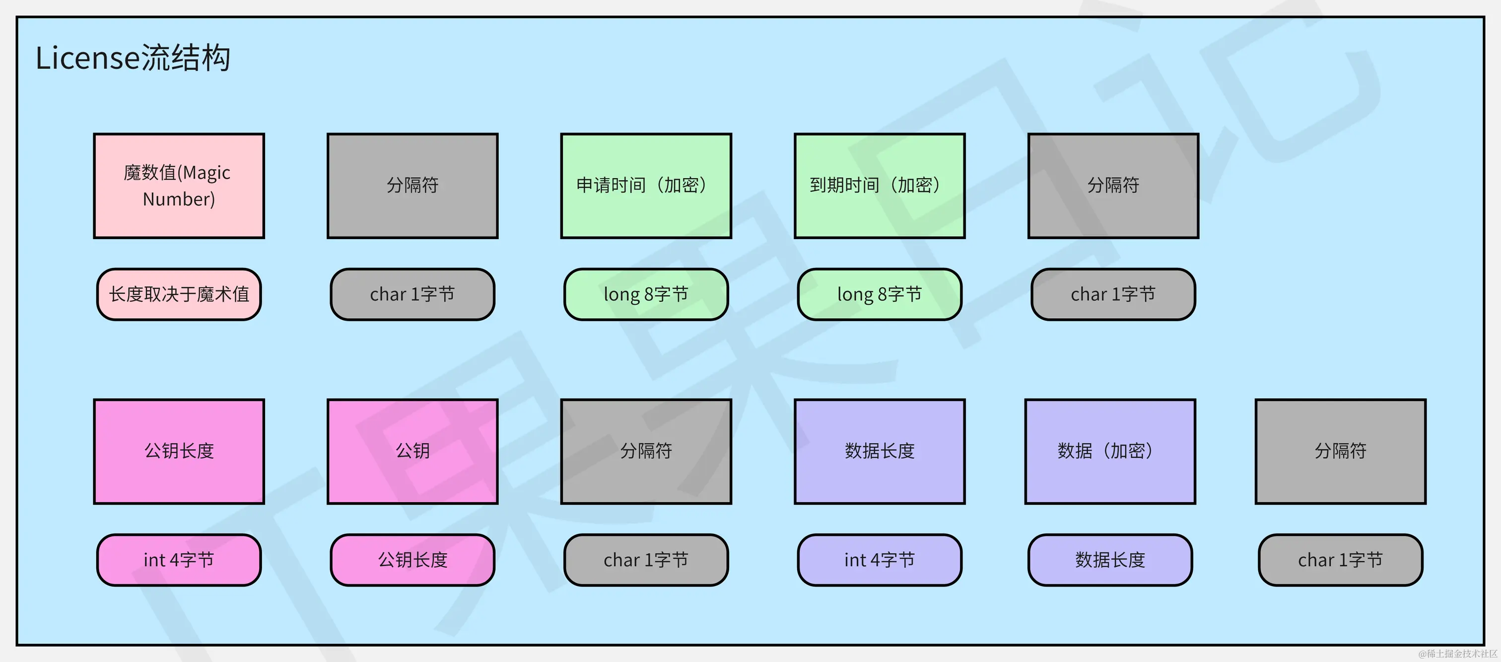 出于性能方面的考慮,大多數(shù)情況下給消息加密還是使用的對稱加密算法,為了解決“密鑰分配問題”,只會在第一次發(fā)送共享密鑰的時候才會使用非對稱加密,一旦消息接收者得到了共享密鑰,通信雙方就能夠通過共享密鑰進(jìn)行通信了。 此外,使用非對稱密鑰對消息簽名也可以防止消息被人篡改,由于性能原因一般不會對消息原文進(jìn)行簽名,而是先通過哈希算法形成消息摘要,再對消息摘要簽名。消息接收者驗簽時會將消息的明文進(jìn)行哈希,再將消息簽名解密,兩者比對如果一致則證明消息沒有被篡改過。 前面鋪墊了一些生成License所必備的基礎(chǔ)知識,我們學(xué)習(xí)了生成的License如果需要防止被人破解,那就需要具有保密性、防篡改和防偽造等特點。接下來要考慮的是License需要攜帶什么信息就能讓其既安全又能限制用戶的使用權(quán)限。 下圖是License文件流的結(jié)構(gòu)圖,主要字段有: