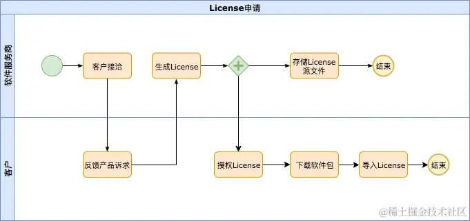 想好了License文件的結(jié)構(gòu),我們就可以開始生成License啦。 申請License的總體流程如下圖所示??蛻粼谲浖?wù)商處申請License,軟件服務(wù)商生成License之后會返回給客戶License文件,自己保留一份License源文件,源文件用作以后找回License。客戶拿到License文件,在安裝、啟動軟件之后激活License。