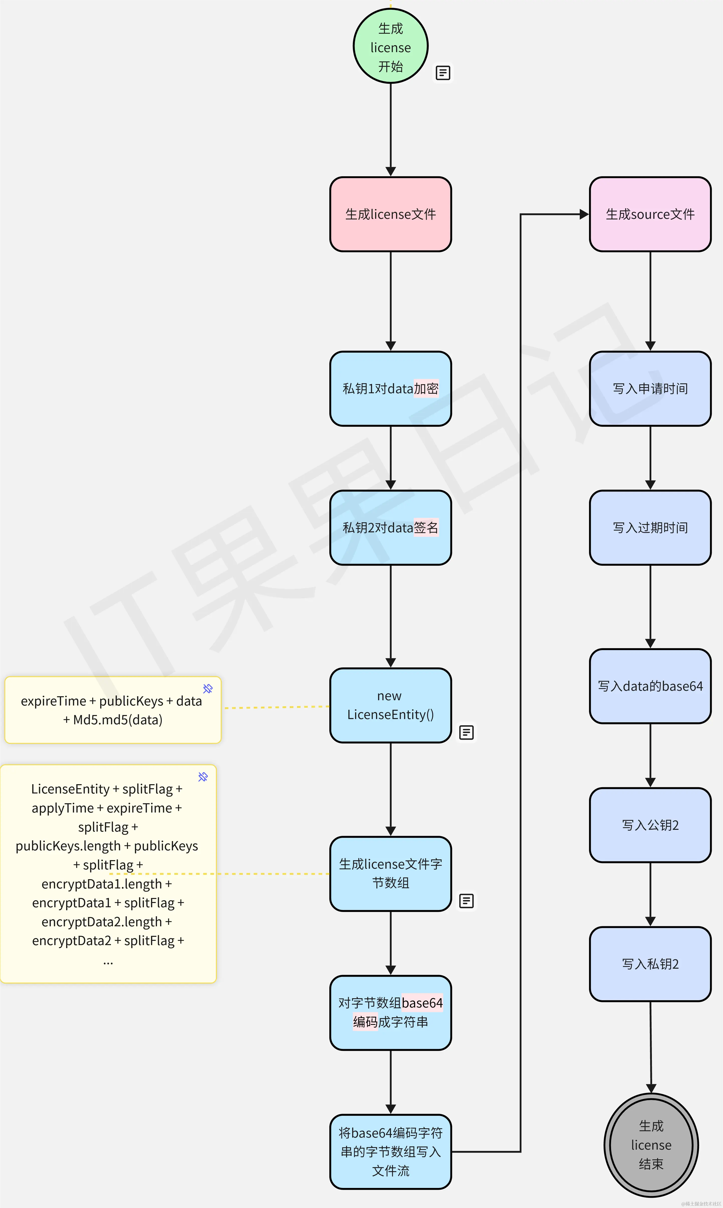 私鑰1加密的作用是對License的安全加固。因為License實際上可以通過Base64解碼得到里面的數(shù)據(jù),包括公鑰信息,這樣客戶就能夠通過公鑰將攜帶的信息解析出來,倘若攜帶有敏感信息就會造成安全問題。所以這里對攜帶的信息做了先加密后簽名的處理。 另外需要強(qiáng)調(diào)的是,申請日期和有效截止日期也需要簽名但不需要加密。因為如果不簽名的話,客戶可以將日期解析出來之后篡改成自己想要的任何日期。