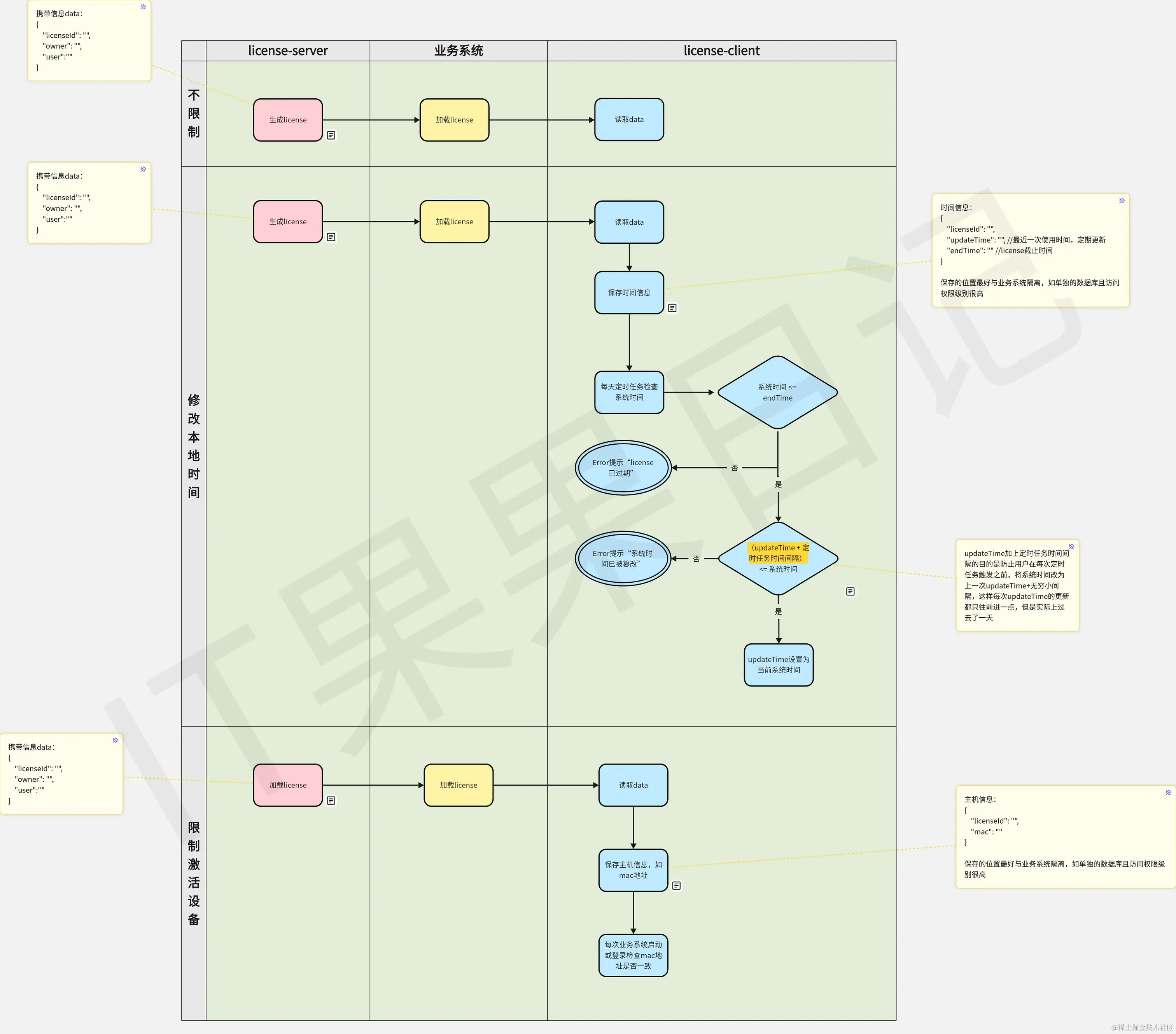 最后整理了一張泳道圖,可以從整體觀察一下不限制、防止篡改系統(tǒng)時間和防止多設(shè)備共享License等問題的解決方案。