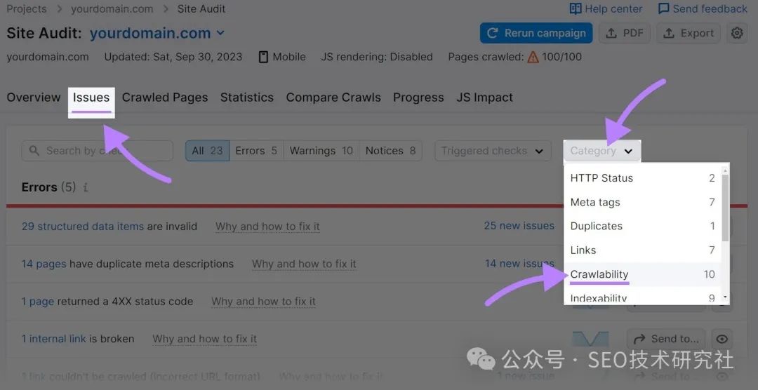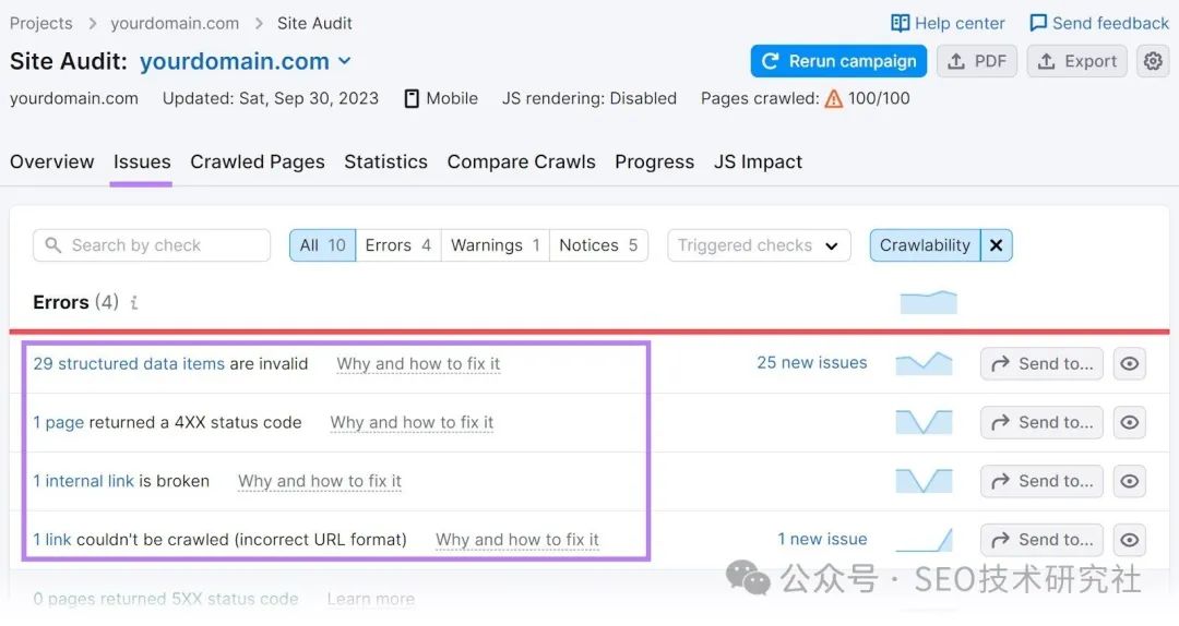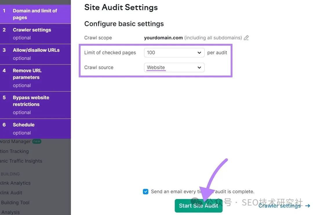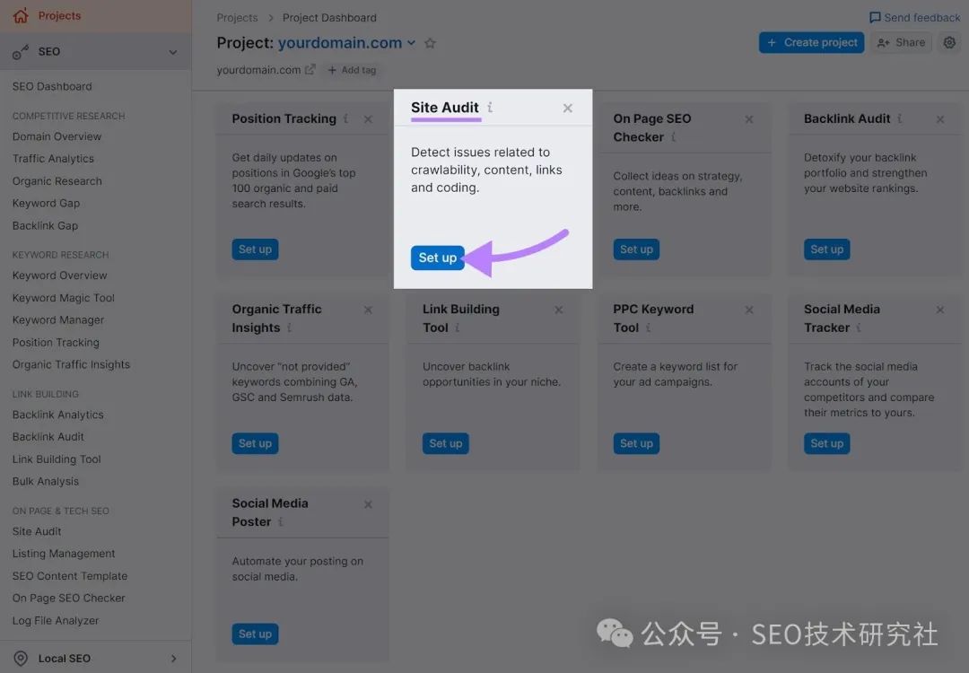 那么,你從哪里開始呢? 首先,勾勒出您網(wǎng)站所需頁面的“骨架”。 例如,您可以從主頁、關(guān)于頁面、服務(wù)頁面、聯(lián)系頁面和博客開始。 然后,每個(gè)都可以有子頁面。 喜歡這個(gè): ![]() 當(dāng)您的網(wǎng)站啟動(dòng)并運(yùn)行時(shí),請運(yùn)行快速審核,以確保不存在任何可抓取性問題。 首先,注冊一個(gè)免費(fèi)的 Semrush 帳戶。 單擊“我的項(xiàng)目”部分中的藍(lán)色“+ 創(chuàng)建項(xiàng)目”按鈕。 ![]() 然后,添加您的域,然后單擊“創(chuàng)建項(xiàng)目”。 這樣: ![]() 您將看到一個(gè)項(xiàng)目儀表板。找到Site Audit,然后單擊“設(shè)置”。 ![]() 然后,選擇要抓取的網(wǎng)頁數(shù),并將“網(wǎng)站”作為抓取源。 然后單擊“開始網(wǎng)站診斷”。 喜歡這個(gè): ![]() 現(xiàn)在,前往“問題”選項(xiàng)卡,然后從“類別”下拉菜單中選擇“可抓取性”。 ![]() 您會(huì)看到網(wǎng)站的可抓取性錯(cuò)誤、警告和通知列表。 ![]() 至少每月進(jìn)行一次這樣的審計(jì)。并解決出現(xiàn)的任何問題。 3. 設(shè)置 Google Search Console 和 Semrush 工具Google Search Console (GSC) 是一款免費(fèi)的 Google 工具,可幫助您監(jiān)控新網(wǎng)站的 SEO 效果并對其進(jìn)行故障排除,尤其是在 Google 搜索中。 ![]() 要進(jìn)行設(shè)置,請打開 Search Console,然后點(diǎn)擊“立即開始”。 ![]() 在第一個(gè)屏幕上,選擇“域”。然后,輸入您的域名,然后單擊“繼續(xù)”。 ![]() 系統(tǒng)將提示您驗(yàn)證您的域名。請按照 Google 的分步說明執(zhí)行此操作。 ![]() 完成驗(yàn)證后,您將能夠使用 GSC 并查看您的分析。 (一開始看不到任何數(shù)據(jù)是正常的。特別是如果你的網(wǎng)站是全新的)。 ![]() GSC 可幫助您了解 Google 如何看待您的網(wǎng)站。以及您的網(wǎng)站在 Google 搜索結(jié)果中的顯示方式。但它并不能提供您需要的所有數(shù)據(jù)。 例如,它提供了有關(guān)您排名的關(guān)鍵字和鏈接到您的網(wǎng)站的有限信息。 要查看全貌,您需要設(shè)置一個(gè) SEO 平臺(tái)。就像 Semrush 一樣。 您將能夠設(shè)置其他項(xiàng)目,包括: