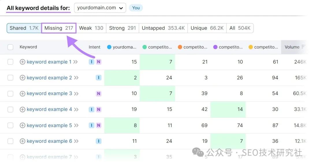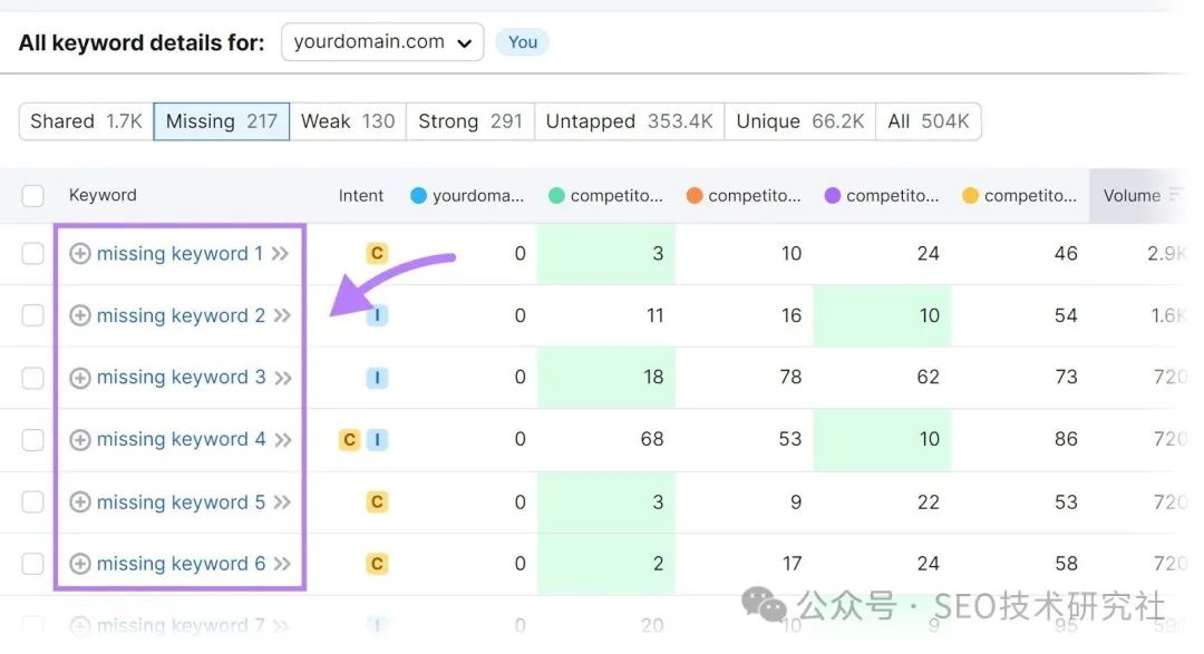 首先,打開 Organic Research,輸入您的域,然后單擊“搜索”。 ![]() 然后,轉(zhuǎn)到“競爭對手”選項(xiàng)卡并向下滾動(dòng)以查看“自然競爭對手”表。 ![]() 這是您的頂級(jí)有機(jī)競爭對手的列表。 現(xiàn)在,您需要進(jìn)行關(guān)鍵字差距分析,將自己與這些競爭對手進(jìn)行比較。 關(guān)鍵詞差距分析是尋找競爭對手排名的關(guān)鍵詞的過程,但你沒有。 每個(gè)“差距”都是您帶來更多流量的機(jī)會(huì)。 首先,打開關(guān)鍵字差距工具。 然后,輸入您的域名和最多四個(gè)競爭對手的域名。然后單擊“比較”。 ![]() 向下滾動(dòng)到表格,然后選擇“缺失”。 ![]() 現(xiàn)在,該表僅顯示所有四個(gè)競爭對手排名的關(guān)鍵字,但不顯示您。 ![]() 這些關(guān)鍵字代表了您創(chuàng)建內(nèi)容并填補(bǔ)這些空白的機(jī)會(huì)。 6.進(jìn)行關(guān)鍵字研究關(guān)鍵詞研究是識(shí)別、分析和選擇關(guān)鍵詞以優(yōu)化你的內(nèi)容以進(jìn)行SEO的過程。 正確地進(jìn)行關(guān)鍵詞研究可以幫助你。