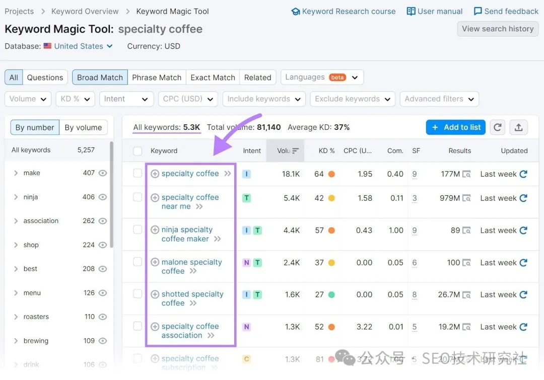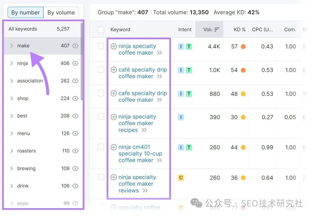 進(jìn)行關(guān)鍵字差距分析是一個(gè)很好的起點(diǎn)。但是使用關(guān)鍵字研究工具會(huì)發(fā)現(xiàn)更多的想法。 前往關(guān)鍵字魔術(shù)工具,輸入種子關(guān)鍵字,然后單擊“開始”。 (種子關(guān)鍵字是你的利基市場中的一個(gè)廣義術(shù)語。 ![]() 你會(huì)得到一個(gè)基于你的種子關(guān)鍵詞的大量想法列表。 喜歡這個(gè): ![]() 第一步將幫助您了解人們在搜索什么。并將關(guān)鍵字分組為主題和子主題。 例如,查看左側(cè)的列。 您可以立即看到不同的組,例如“商店”、“菜單”、“食譜”、“評論”等。 ![]() 單擊相關(guān)組以查找相關(guān)關(guān)鍵字。并使用您的利基市場中的其他種子關(guān)鍵字來執(zhí)行此操作。 您將獲得大量可以構(gòu)建的頁面、可以提供的服務(wù)以及可以創(chuàng)建的內(nèi)容的想法。 7.創(chuàng)建針對SEO優(yōu)化的內(nèi)容當(dāng)您開始一個(gè)新網(wǎng)站時(shí),您有很多內(nèi)容需要從頭開始創(chuàng)建。SEO的優(yōu)化至關(guān)重要。 方法如下: 搜索意圖搜索意圖是某人進(jìn)行搜索查詢的原因或動(dòng)機(jī)。 搜索意圖主要有四種類型: