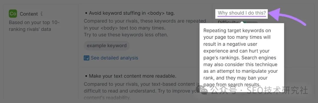要快速優(yōu)化您網(wǎng)站的頁面搜索引擎優(yōu)化,請通過頁面搜索引擎優(yōu)化檢查器運(yùn)行它。 選擇或輸入您的域名,然后單擊“獲取提示”。 ![]() 然后,您將看到一個(gè)儀表板,其中包含大量按類別方便分組的優(yōu)化想法。 ![]() 單擊“優(yōu)化思路”選項(xiàng)卡。你會(huì)看到一個(gè)表格,里面有按優(yōu)先級(jí)排序的想法。 喜歡這個(gè): ![]() 此優(yōu)先級(jí)基于優(yōu)化想法的數(shù)量、頁面的潛在流量以及實(shí)施這些想法的難易程度。 首先從優(yōu)先級(jí)最高的頁面開始。這些可能會(huì)產(chǎn)生最好的結(jié)果。 為此,請單擊藍(lán)色的“#想法”按鈕。您將看到一個(gè)報(bào)告,其中包含該特定頁面的所有想法。 ![]() 將鼠標(biāo)懸停在“我為什么要這樣做?”上,以了解有關(guān)該想法背后的原因的更多信息。 ![]() 努力實(shí)現(xiàn)該工具建議的想法。而且,您將提高最重要的頁面排名更高的機(jī)會(huì)。 8.推廣你的網(wǎng)站現(xiàn)在您已經(jīng)創(chuàng)建了網(wǎng)站并對其進(jìn)行了優(yōu)化,是時(shí)候讓人們知道了。人們不會(huì)神奇地自己來。 要開始推廣您的網(wǎng)站,您可以:
