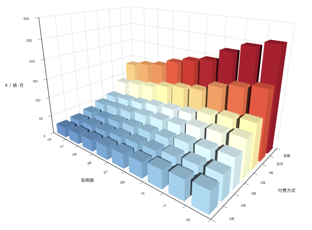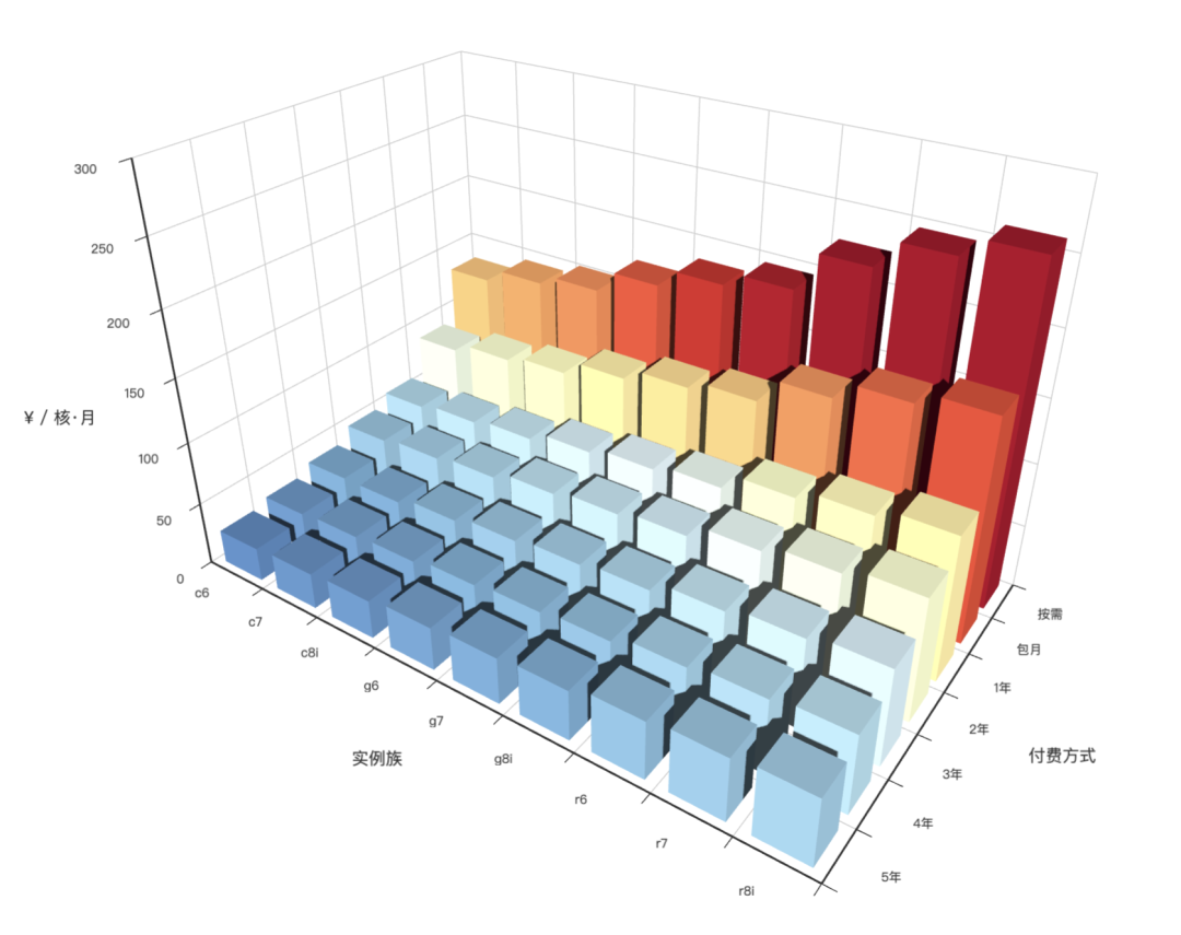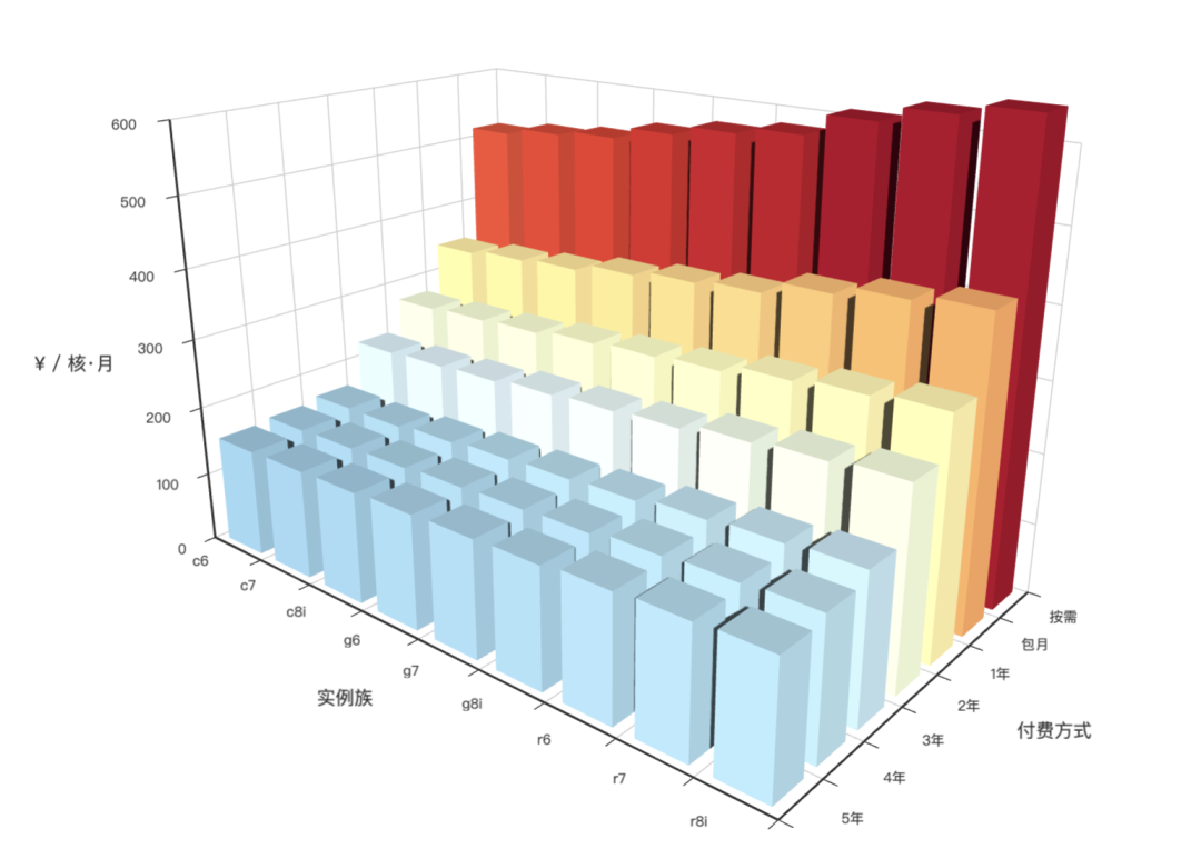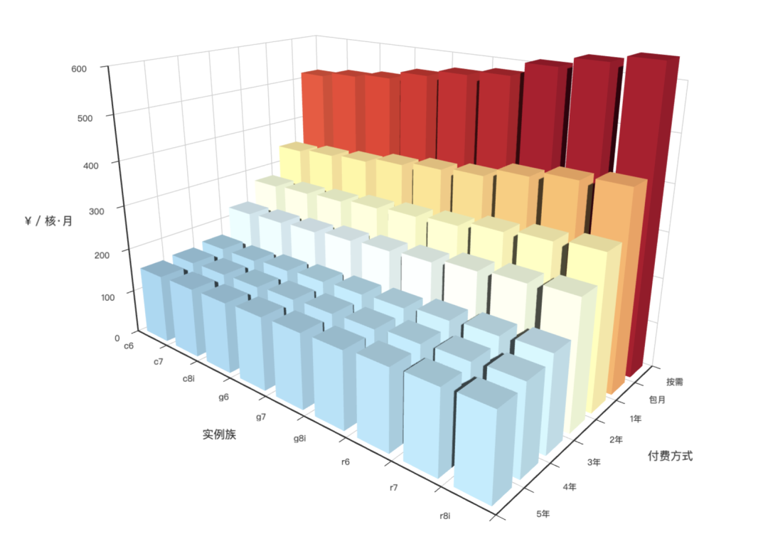 上圖展示了不同實(shí)例族在不同付費(fèi)模式下的價格對比。如果我們對所有實(shí)例價格取一個平均(大致相當(dāng)于 1c4g 機(jī)型的標(biāo)準(zhǔn)價),不同付費(fèi)模式下的算力均價如柱狀圖所示: