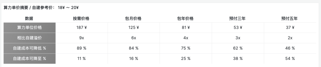 我們可以使用 DDH 2023 年下云自建的案例,以及我自己在探探親身經(jīng)歷的云下 IDC 自建案例作為對比。刨除 NVMe 存儲部分后,DHH 自建的純算力單價為 22 ¥,探探自建的單價為 18 ¥。請注意,此成本數(shù)字中已經(jīng)包含了服務(wù)器費(fèi)用,交換機(jī)/機(jī)柜/網(wǎng)/電/代維/運(yùn)維人員均攤后的費(fèi)用。