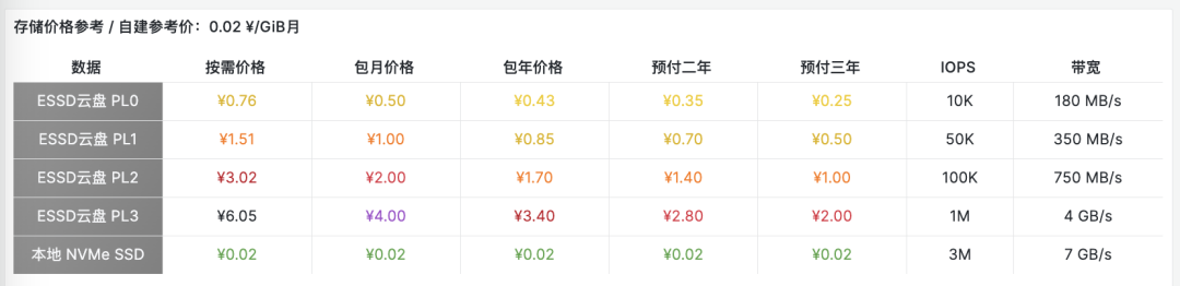 拋開系統(tǒng)盤/HDD這種乞丐盤,在阿里云上提供了四種不同規(guī)格等級的塊存儲:ESSD PL0 ~ PL3。其單位價格分別為:0.5, 1, 2, 4。ESSD PL3 的性能勉強(qiáng)接近本地 Gen3 NVMe SSD,但它 4 塊錢的單價是本地自建的 200 倍!當(dāng)然 ESSD 也有自己獨(dú)立的折扣策略 —— 預(yù)付費(fèi)三年以上,ESSD 可以打滿頂折 5 折,但那也是 100 倍溢價了!