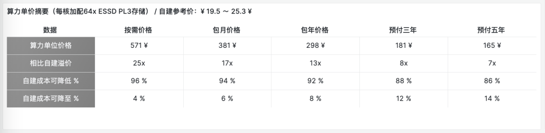 在《云盤是不是殺豬盤》中我們已經(jīng)詳細(xì)對比過云盤與本地盤的性能、可靠性與成本,因此這里主要使用與本地 NVMe SSD 最接近的 ESSD 云盤 PL3 作為對比。如果我們?yōu)槊亢?CPU 配置 64 GiB 的 PL3 塊存儲,則調(diào)整后的云服務(wù)器單價為:381 ¥。在此基礎(chǔ)上:按量付費(fèi)需要額外支付 50% 溢價,為 571 ¥;包年預(yù)付為 298 ¥,包三年可以打 44 折為 181 ¥,預(yù)付五年可以打三折為 165。 與 DHH / 探探自建的含存儲單價 22.4 ¥ 相比 云服務(wù)器單價達(dá)到了自建的 6 ~ 25 倍!