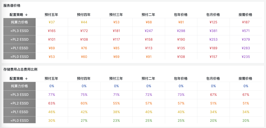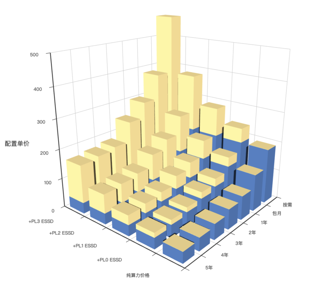 存儲對單價的影響在服務(wù)器價格構(gòu)成中,存儲是變數(shù)最大的。 例如,以上面的標(biāo)準(zhǔn)配置:1核 : 4x內(nèi)存 : 64x存儲,在使用不同規(guī)格的 ESSD 的情況下,存儲費(fèi)用占服務(wù)器費(fèi)用的比例差異非常之大。