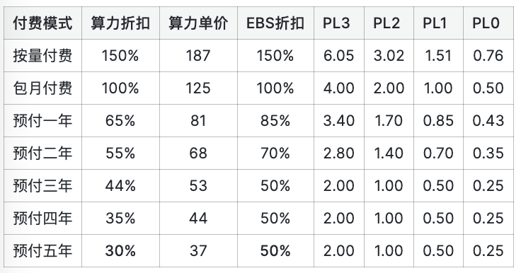 請注意,ESSD 塊存儲和 ECS 算力的折扣力度是不同步的,由于 SSD 的頂配折扣(5折)比純算力的頂配折扣(3折)要更弱,所以存儲費(fèi)用比例隨著預(yù)付費(fèi)時長變長會越來越高。 付費(fèi)模式的影響預(yù)付費(fèi)方式對云服務(wù)器的價格有著顯著影響:算力的價格以包月價格作為標(biāo)準(zhǔn),按需付費(fèi)價格上浮 50%,包年打 65 折,包二、三、四、五年的折扣分別是55,44,35,30 折。 存儲的價格同樣以包月價格作為基準(zhǔn),按需付費(fèi)的價格上浮 51.25%,包年打85折,兩年七折,三年以上五折。ECS 算力的單價(¥/核月)與塊存儲 ESSD 的單價(¥/GiB月)和折扣規(guī)則如下表所示。