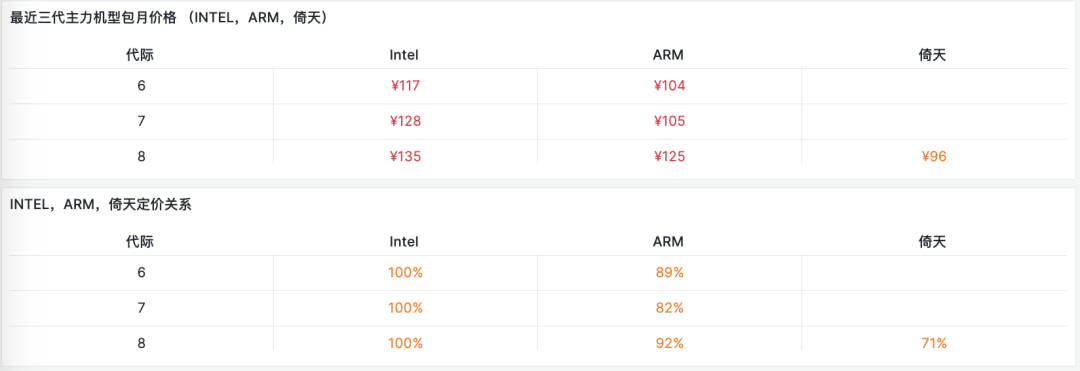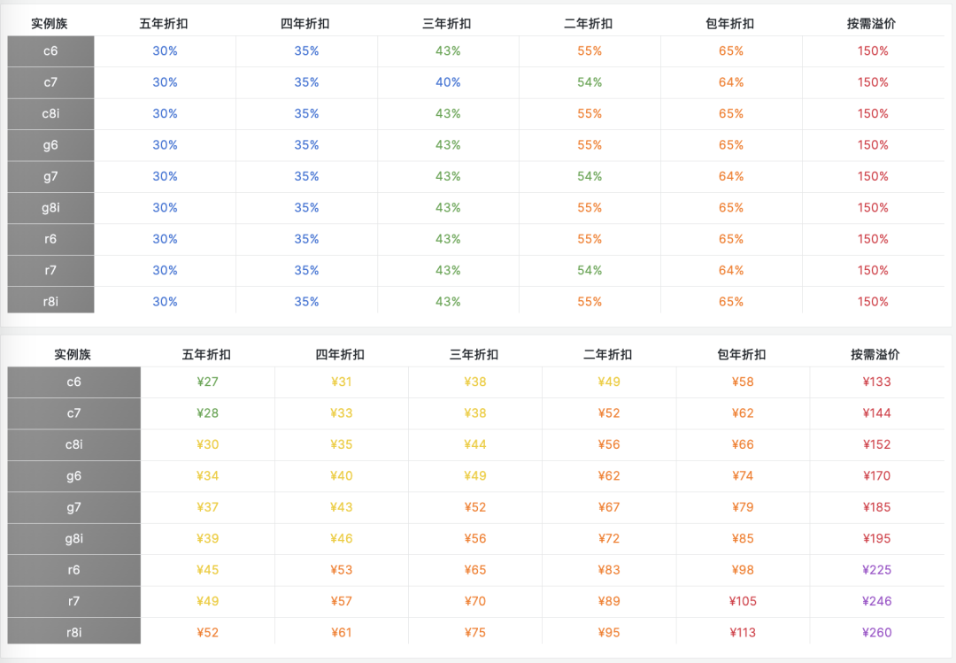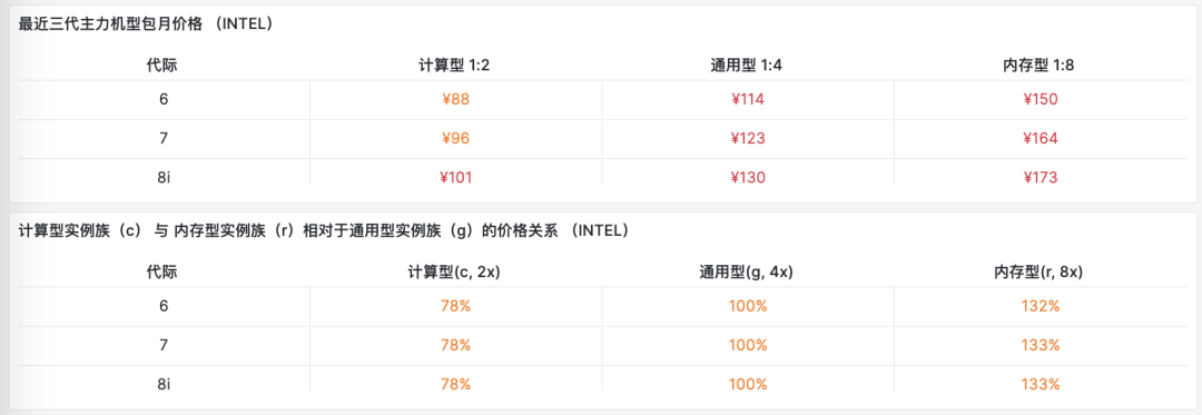 對于純算力來說,最近三代主流實(shí)例族的價格與比例如下表所示,不難看出實(shí)際定價相當(dāng)符合上面給出的模型:
