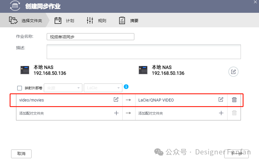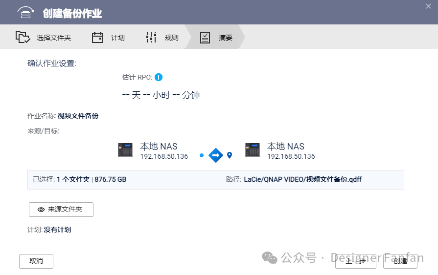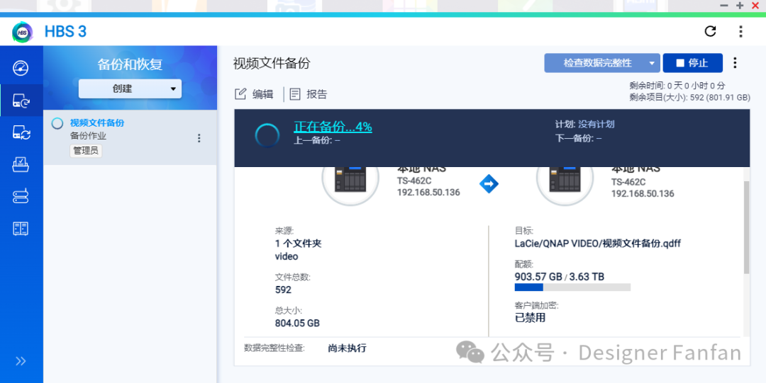 使用NAS,什么最重要?當(dāng)然是數(shù)據(jù)安全。NAS可以對(duì)家中電腦、手機(jī)的文件進(jìn)行備份,從而實(shí)現(xiàn)數(shù)據(jù)安全。在APP Center里面有HBS 3文件備份,而我們最常用的備份工具也就是HBS3,全中文界面,使用起來沒有任何技術(shù)門檻。通過一鍵安裝,將移動(dòng)硬盤連接到NAS的usb口之后,可以在存儲(chǔ)管理器里面識(shí)別到了移動(dòng)硬盤。打開HBS3之后,點(diǎn)擊立即備份下拉菜單中的新備份作業(yè)。選擇要備份的文件夾,我這里選擇的是video文件夾。點(diǎn)擊下一步選擇目標(biāo)設(shè)備。目標(biāo)設(shè)備中我們是看不到移動(dòng)硬盤的,而且支持本地備份和云備份兩種類型,如果你有超大切安全的云盤,也可以選擇。因?yàn)橐苿?dòng)硬盤連接的是本地的NAS,所以這里選擇本地NAS,然后下一步,就可以看到8T的雷孜小金剛移動(dòng)硬盤了。新建一個(gè)文件夾,然后選擇新建的QNAP VIDEO進(jìn)行備份文件。然后設(shè)置備份作業(yè)名稱,方便記憶。可以看到需要備份800+G的內(nèi)容。然后下一步備份頁(yè)面,外接設(shè)備的讀寫速度越快,備份所用時(shí)間就越短。可以看出來備份的格式是無(wú)法被其他電腦識(shí)別的,而且在nas里面也無(wú)法讀取。