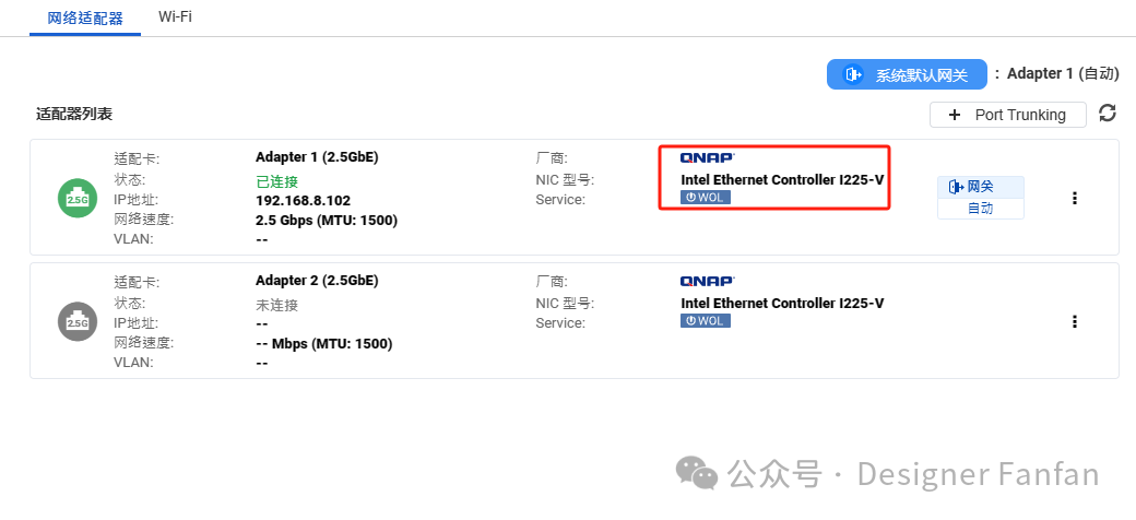 現(xiàn)在很多NAS都支持WOL功能了,在網(wǎng)絡(luò)設(shè)置頁(yè)面可以看到目前使用的網(wǎng)卡是2.5G連接,當(dāng)然威聯(lián)通TS464C2也同樣支持WOL(wake on lan)功能,這個(gè)功能做大的特點(diǎn)就是可以通過路由器進(jìn)行遠(yuǎn)程開機(jī),不過前提是路由器也要支持WOL。