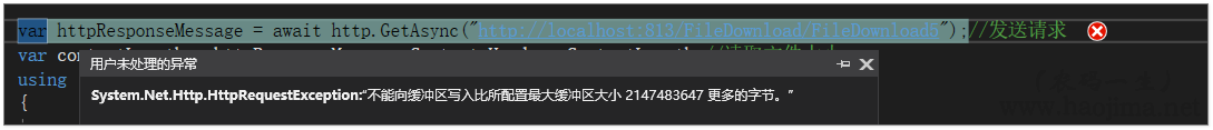 我們看到了一個(gè)異常“System.Net.Http.HttpRequestException:“不能向緩沖區(qū)寫入比所配置最大緩沖區(qū)大小 2147483647 更多的字節(jié)?!?,什么鬼,又是2147483647這個(gè)數(shù)字。因?yàn)槲覀兿螺d的文件大小超過了2G,無法緩沖下載。