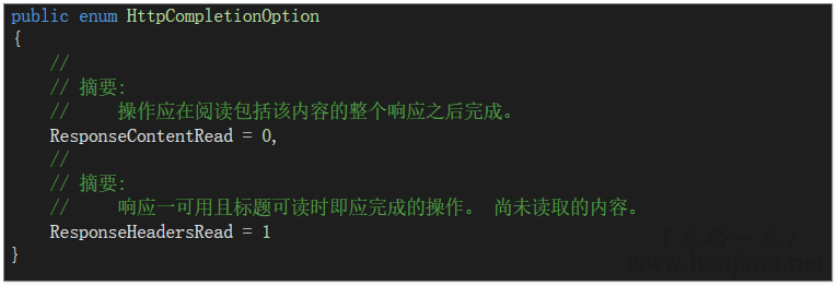 我們看到枚舉HttpCompletionOption的兩個(gè)值。一個(gè)是響應(yīng)讀取內(nèi)容,一個(gè)是響應(yīng)讀取標(biāo)題(也就是Headers里的內(nèi)容)。