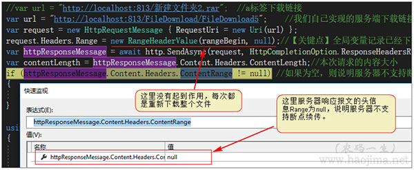 if (httpResponseMessage.Content.Headers.ContentRange != null) //如果為空,則說明服務(wù)器不支持?jǐn)帱c(diǎn)續(xù)傳
