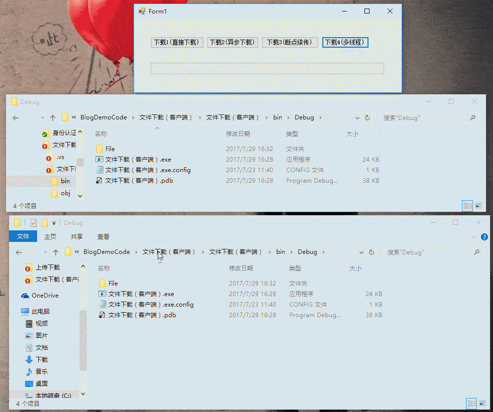 還有我們可以根據(jù)表頭屬性Range來實(shí)現(xiàn)多線程下載,不過這里就不貼代碼了,貼個(gè)效果圖吧。和上一篇文件上傳里的多線程上傳同理。您也可以根據(jù)提供的demo代碼下載查看,內(nèi)有完整實(shí)現(xiàn)。