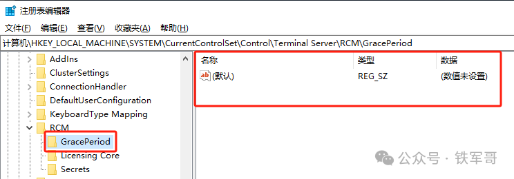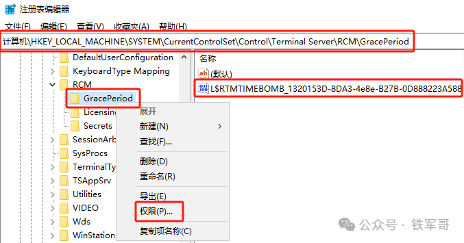 然后找到GracePeriod注冊(cè)表,這個(gè)鍵值與遠(yuǎn)程桌面服務(wù)的授權(quán)有關(guān),特別作用于存儲(chǔ)某種類型的寬限期信息。
