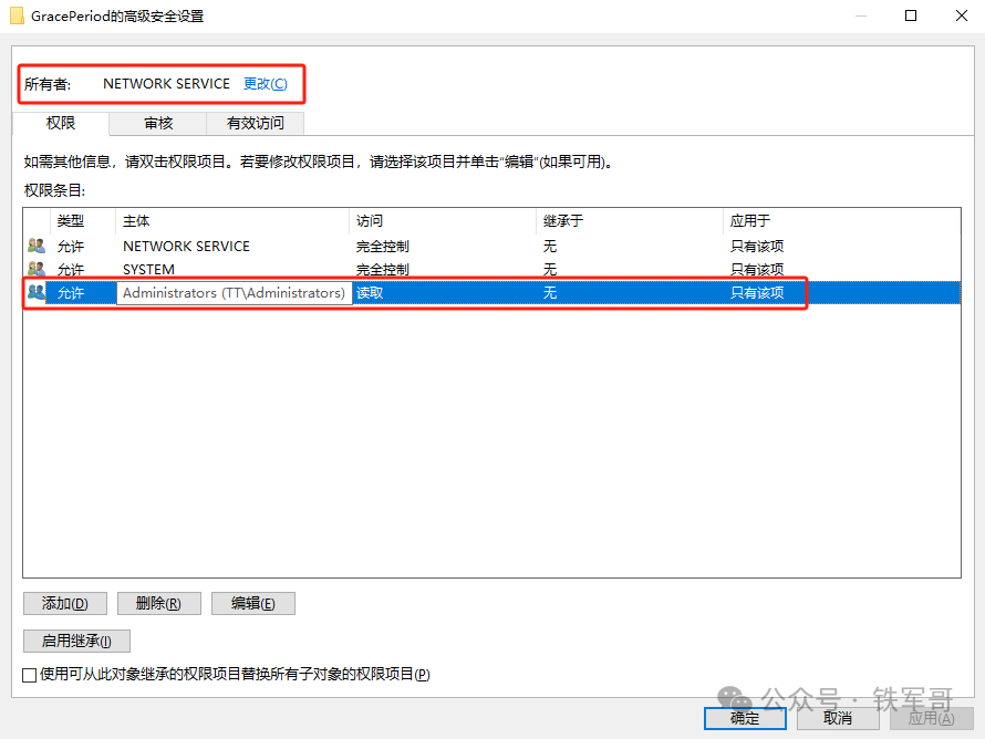 可以看到,現(xiàn)在該注冊(cè)表項(xiàng)的所有者是NETWORK SERVICE,而Administrators用戶組只有讀取權(quán)限,無(wú)法修改。所以只要將所有者變更為Administrators用戶組就好了。