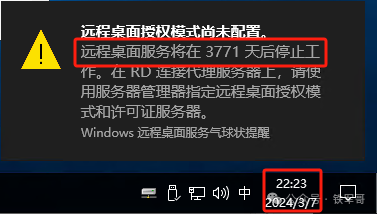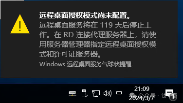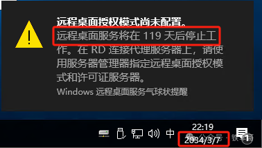 我們前面介紹了如何實(shí)現(xiàn)Windows Server的多用戶登錄(Windows Server調(diào)整策略實(shí)現(xiàn)999999個(gè)遠(yuǎn)程用戶用時(shí)登錄),但是有一個(gè)實(shí)用性的問(wèn)題,那就是只有119天的臨時(shí)授權(quán)。比如我現(xiàn)在登錄時(shí),就會(huì)冒泡提醒我,“遠(yuǎn)程桌面服務(wù)將在65天后停止工作”。