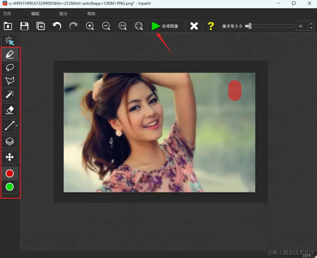 第一款:InpaintInpaint是一款專業(yè)的去圖片水印瑕疵軟件,可以從圖片中去除不想要的部分,輕松擺脫圖片上的水印、劃痕、污漬、標(biāo)志等瑕疵, 不必動(dòng)用龐大PS來(lái)興師動(dòng)眾,只需使用Inpaint即可輕松搞定。 非常方便小巧的軟件,對(duì)于一些不想裝PS等大型軟件,不會(huì)用不常用PS軟件的人,或者不想費(fèi)事,殺雞用牛刀,用此軟件是非??旖菔∈拢r(shí)省力。對(duì)于照片中的物體,照片中拍到不相關(guān)的路人都可以輕松去除,去水印,去照片痘痘,斑點(diǎn)都可以輕松完成。 軟件使用也簡(jiǎn)單,左邊有一系列工具,類似PS里面的工具箱,使用涂抹后,點(diǎn)擊上面的綠色箭頭按鈕即可。