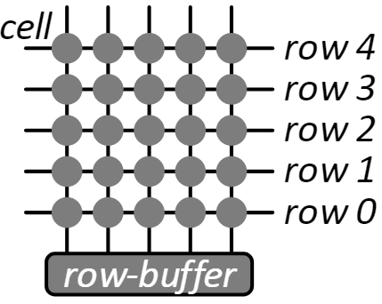 這些存儲單元被組織成多行多列,形成一個二維陣列(Bank,如下圖所示)。當(dāng)讀取或?qū)懭雰?nèi)存數(shù)據(jù)時,一個存儲單元行會被激活,整行的數(shù)據(jù)會被加載到行緩沖器(row-buffer)中,同時存儲單元中的電容放電,在行緩沖器內(nèi)完成數(shù)據(jù)的讀寫操作。在操作完成后,行緩沖器內(nèi)的數(shù)據(jù)會寫入原來的存儲單元行之中,同時存儲單元中的電容充電。所以,不論是讀還是寫數(shù)據(jù),存儲單元都會充放電。