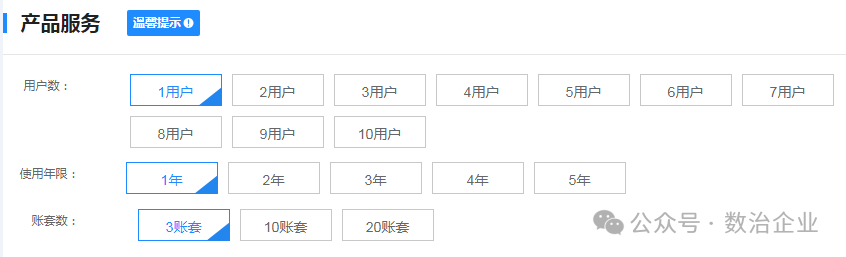 1用戶(hù)3帳套 | 798元/年 | 增加1用戶(hù)500元/年 ,往后遞增會(huì)再減少百元;帳套增加10個(gè)多200元/年,只能往10帳套、30帳套增加 |