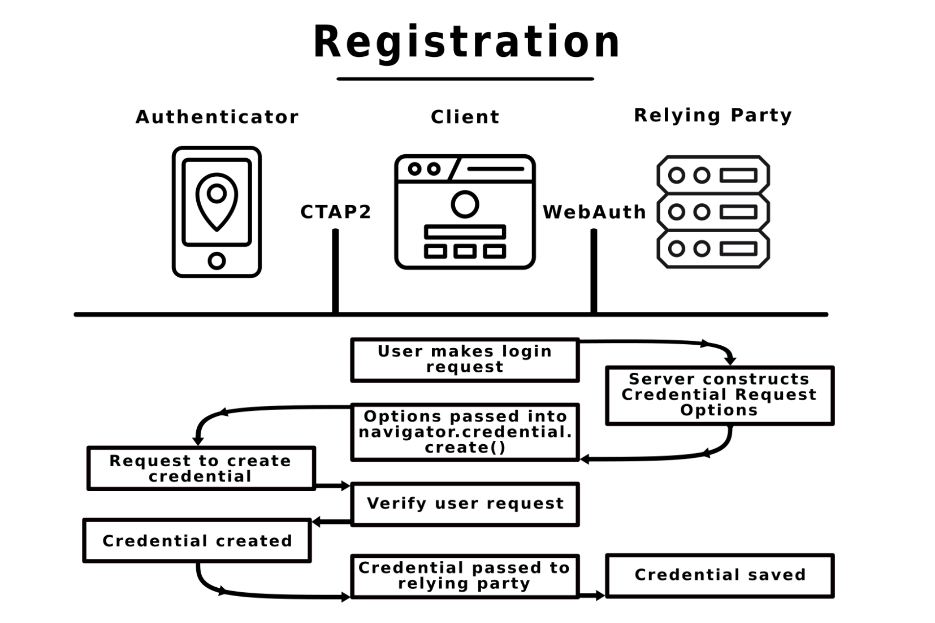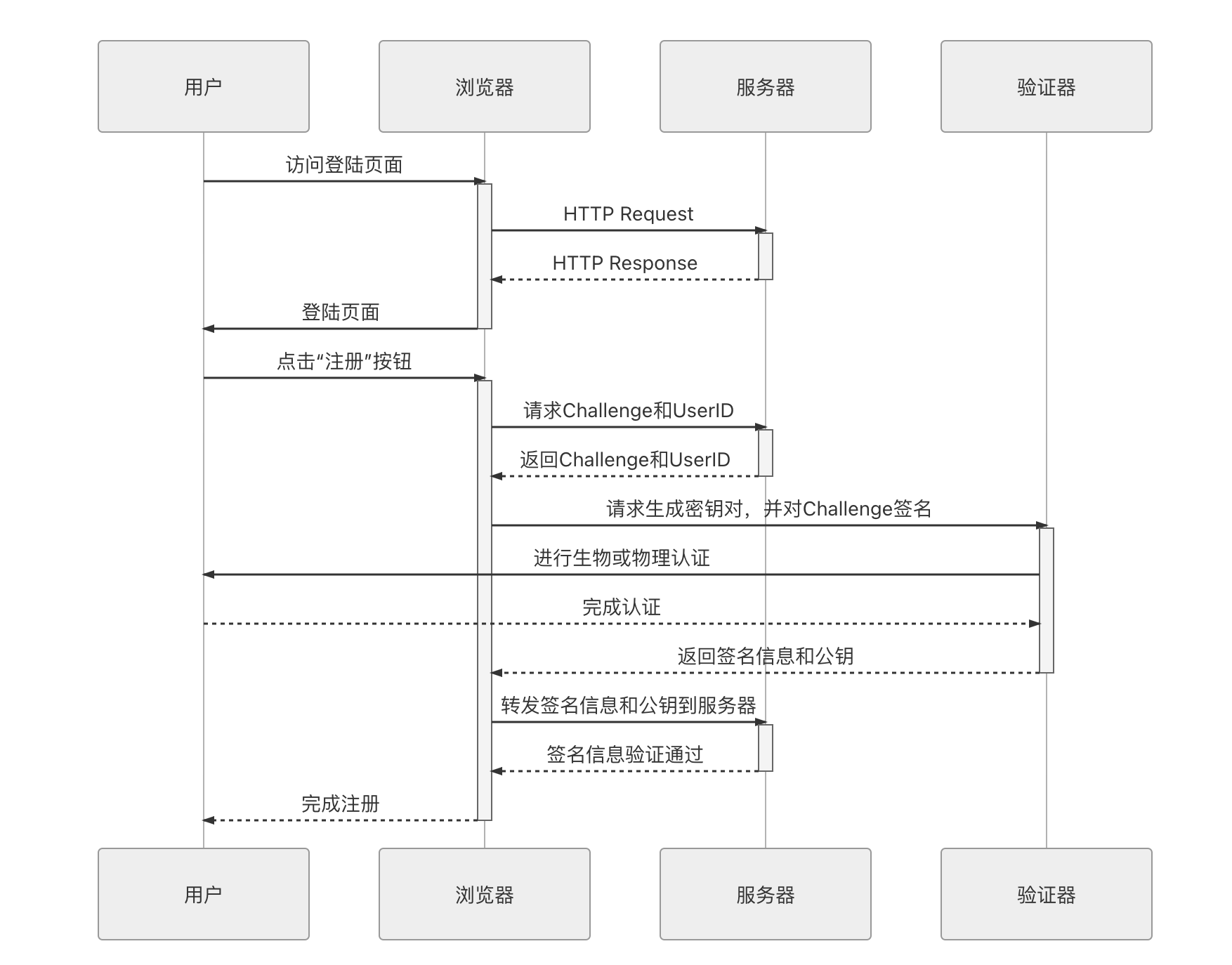 實現(xiàn)原理 WebAuthn 實現(xiàn)較為復(fù)雜,這里不做詳細描述,具體可參看權(quán)威的官方文檔,大概交互過程可以參考以下時序圖: