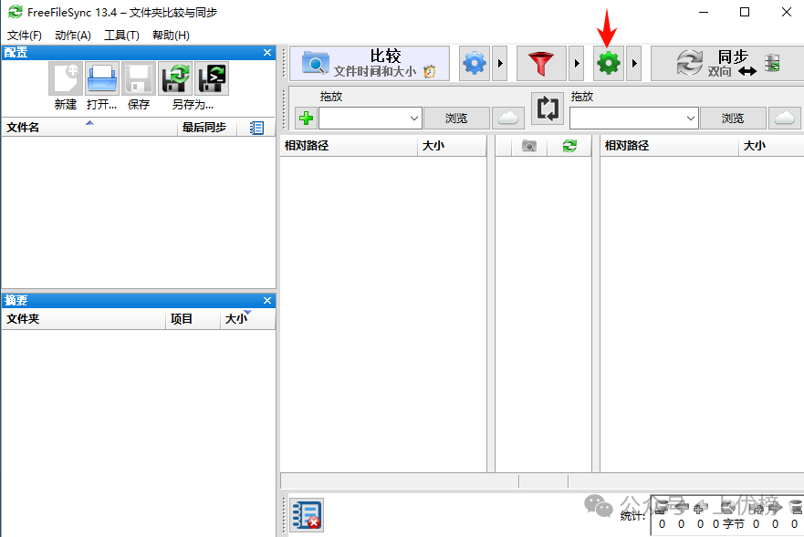 安裝完成后,會(huì)在桌面上生成兩個(gè)圖標(biāo),雙擊“FreeFileSync”綠色圖標(biāo)就可以打開FreeFileSync的主界面了 在主界面中點(diǎn)擊頂部綠色的齒輪圖標(biāo),可以進(jìn)入“同步設(shè)置”界面