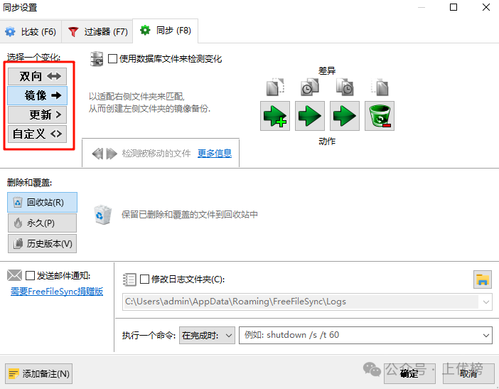 可以看到FreeFileSync有四種不同的同步模式,分別是雙向同步、鏡像同步更新同步和自定義同步,下面分別解釋一下這四種同步方式: