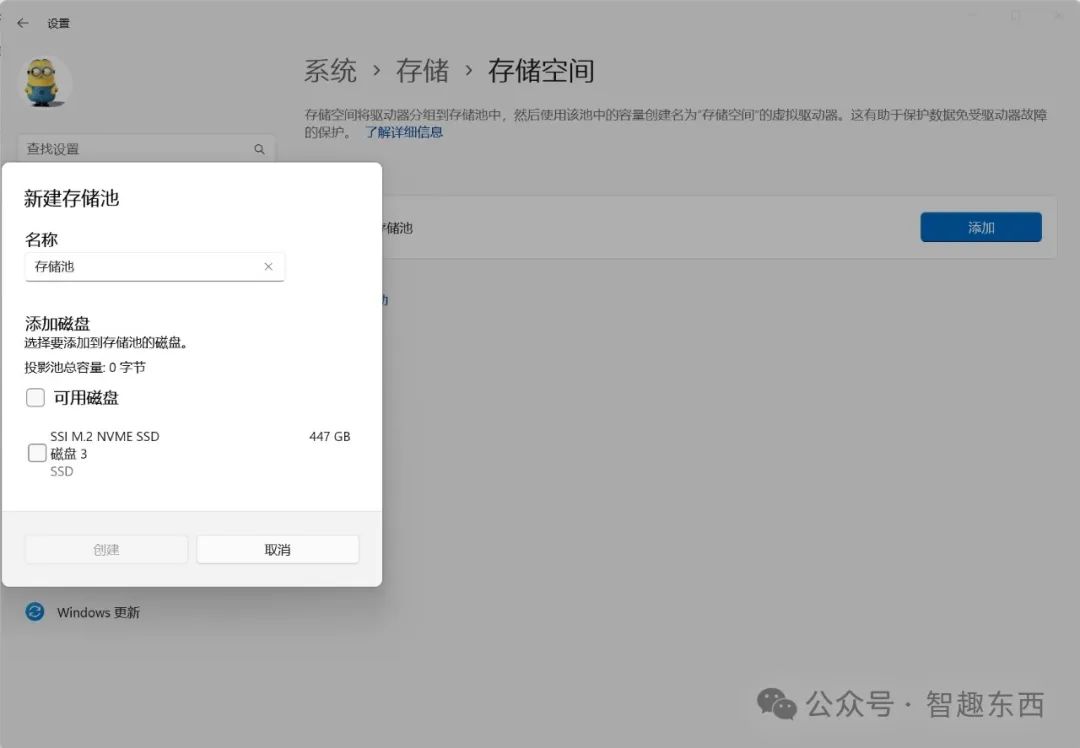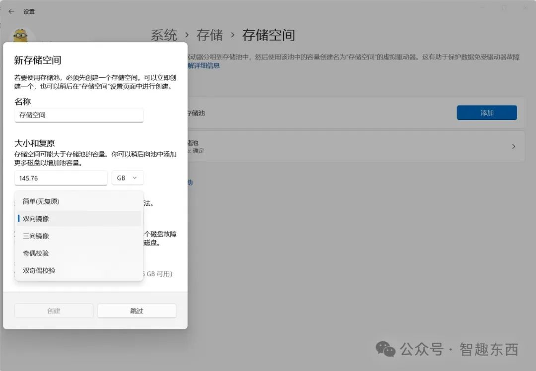把存儲數(shù)據(jù)用的硬盤準(zhǔn)備好,無論是幾塊都可以,沒有數(shù)量硬性要求(后面會詳細(xì)說),然后在電腦上打開設(shè)置,依次進(jìn)入系統(tǒng)→存儲→高級存儲設(shè)置→存儲空間,Windows10或者Windows 11都可以按照這個(gè)方式操作。 點(diǎn)擊“添加”創(chuàng)建存儲池,此時(shí)會列表形式展示究竟有多少塊硬盤,如果沒有特別挑選,可以直接點(diǎn)擊“可用磁盤”一股腦全選上然后點(diǎn)擊“創(chuàng)建”——放心,系統(tǒng)盤會自動排除在外。 解這就是設(shè)置存儲空間的數(shù)據(jù)安全方式,單塊硬盤自然沒有任何數(shù)據(jù)保護(hù)措施,只要達(dá)到至少兩塊以上的可用硬盤,就可以選擇不同的存儲方式了。 “復(fù)原類型”中分別有5種不同的存儲類型,它們的具體區(qū)別如下: 簡單(無復(fù)原):簡單存儲空間寫入一個(gè)數(shù)據(jù)副本,在磁盤發(fā)生故障時(shí)無法提供數(shù)據(jù)保護(hù)(至少需要1塊可用磁盤)。 雙向鏡像:雙向鏡像存儲空間寫稿兩個(gè)數(shù)據(jù)副本,以在一個(gè)塊磁盤損壞時(shí)提供數(shù)據(jù)冗余保護(hù)(至少需要2塊可用磁盤)。 三向鏡像:三向鏡像存儲空間寫入三個(gè)數(shù)據(jù)副本,可以在兩塊磁盤同時(shí)故障時(shí)提供數(shù)據(jù)冗余保護(hù)(至少需要3塊可用磁盤)。