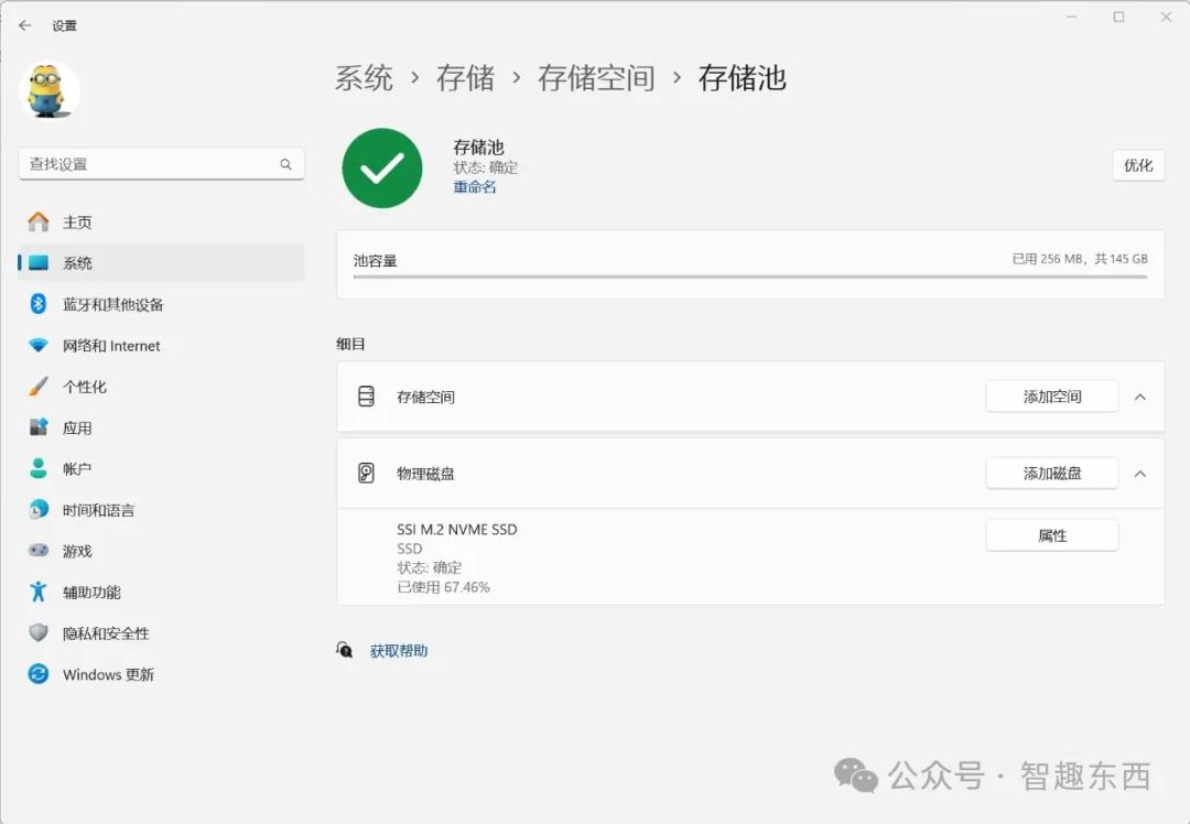 這時(shí)候存儲設(shè)置就算完成了,你可以在存儲空間中看到目前的存儲池情況,點(diǎn)擊可以進(jìn)入進(jìn)行調(diào)整修改。 存儲池頁面會羅列當(dāng)前已經(jīng)使用的物理磁盤,還可以無縫臨時(shí)添加硬盤——存儲空間的好處是靈活,不同規(guī)格、不同容量的硬盤可以放在一起組建這個(gè)存儲池,不需要硬盤容量相當(dāng)、成對數(shù)組合。