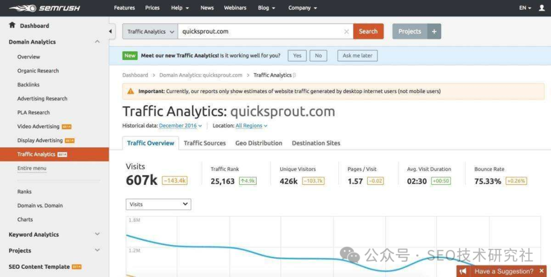 3、SEMRush一款多合一的流量分析和競爭研究工具,它是分析和監(jiān)視任何網(wǎng)站流量的實用工具。 優(yōu)點: (1)數(shù)據(jù)覆蓋面廣,它提供了全球范圍內的搜索引擎數(shù)據(jù),用戶可以輕松地進行關鍵詞研究,并監(jiān)測自己的排名變化; (2)提供了競爭對手分析工具,用戶可以了解競爭對手的關鍵詞策略和廣告活動,從而優(yōu)化自己的營銷策略。 缺點: (1)價格貴,對于個人用戶來說可能有些昂貴; (2)數(shù)據(jù)龐大且復雜,初學者可能需要一些時間來適應和理解其中的各種指標和報告; (3)解決問題的能力有限,用戶還需要結合其他工具和策略來獲得更好的效果。