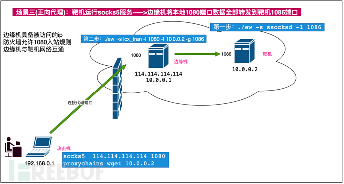 場景三(正向代理):靶機(jī)側(cè)運(yùn)行工具啟動socks5服務(wù),邊緣機(jī)側(cè)運(yùn)行工具將本地從1080端口收到的數(shù)據(jù)全部轉(zhuǎn)發(fā)到靶機(jī)1086端口,在攻擊機(jī)側(cè)使用代理工具(例如:proxychains)連接邊緣機(jī)提供的1080端口;最終達(dá)到攻擊機(jī)側(cè)與靶機(jī)之間形成socks5代理通道,繼續(xù)滲透掃描內(nèi)網(wǎng)。