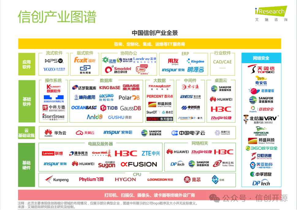 “信創(chuàng)”(全稱“信息技術(shù)應(yīng)用創(chuàng)新”)是國家基于國產(chǎn)芯片和操作系統(tǒng)的PC、服務(wù)器、網(wǎng)絡(luò)設(shè)備、存儲設(shè)備、數(shù)據(jù)庫、中間件等基礎(chǔ)設(shè)施的技術(shù)創(chuàng)新。 信創(chuàng)關(guān)系網(wǎng)絡(luò)安全和國家安全,一直以來受到國家大力支持和推動,經(jīng)歷了四個發(fā)展階段。 一是雛形起步階段(2006-2013):2006年國家啟動核高基戰(zhàn)略,我國的自主芯片雛形初現(xiàn),基礎(chǔ)軟硬件實(shí)現(xiàn)零的突破。 二是初步試點(diǎn)階段(2014-2017):2014年國家網(wǎng)絡(luò)安全與信息化領(lǐng)導(dǎo)小組成立,2016年信創(chuàng)工作委員會成立,該階段國家選擇15家單位開展黨政信創(chuàng)工程第一批試點(diǎn);在小型機(jī)領(lǐng)域,金融行業(yè)出現(xiàn)去IOE(IBM主機(jī)、Oracle數(shù)據(jù)庫、EMC存儲)信創(chuàng)案例。 三是規(guī)?;圏c(diǎn)階段(2017-2019):2017年全國網(wǎng)絡(luò)安全與信息化工作會議召開,黨政信創(chuàng)工程第二期試點(diǎn)啟動,100余家單位開展試點(diǎn),2019年黨政信創(chuàng)工程二期試點(diǎn)完成。該階段飛騰、鯤鵬、龍芯、申威、兆芯等多路線快速突破,基礎(chǔ)軟硬件從無到有,黨政信創(chuàng)快速推進(jìn),產(chǎn)業(yè)生態(tài)逐漸豐富。 四是全面應(yīng)用推廣的新階段(2020-2023):2020年黨政信創(chuàng)三期開始招標(biāo),黨政信創(chuàng)確定三年完成的計(jì)劃表,并由黨政信創(chuàng)為主,向金融、醫(yī)院、教育、航空航天、石油、電力、電信、交通等重點(diǎn)行業(yè)領(lǐng)域全面推廣。新階段出現(xiàn)飛騰2000+、鯤鵬920、麒麟操作系統(tǒng)V10等自主安全基礎(chǔ)軟硬件最新成果。 國務(wù)院印發(fā)的《“十四五”數(shù)字經(jīng)濟(jì)發(fā)展規(guī)劃》中,十四五數(shù)字經(jīng)濟(jì)發(fā)展主要指標(biāo)明確指出到2025年行政辦公及電子政務(wù)系統(tǒng)要全部完成國產(chǎn)化替代。 2022年9月底國資委下發(fā)79號文,全面指導(dǎo)國資信創(chuàng)產(chǎn)業(yè)發(fā)展和進(jìn)度。政策要求所有央企國企在2022年11月份基于計(jì)劃上報替換的系統(tǒng),2023年每季度向國資委匯報。到2027年央企國企100%完成信創(chuàng)替代,替換范圍涵蓋芯片、基礎(chǔ)軟件、操作系統(tǒng)、中間件等領(lǐng)域。 我國信創(chuàng)行業(yè)已基本建立起從上游芯片到下游應(yīng)用的替代產(chǎn)業(yè)鏈條。從產(chǎn)業(yè)鏈角度看,信創(chuàng)生態(tài)體系主要由基礎(chǔ)硬件、基礎(chǔ)軟件、應(yīng)用軟件、網(wǎng)絡(luò)安全幾部分組成。所涉及領(lǐng)域包括硬件方面(整機(jī)、服務(wù)器等);軟件方面(操作系統(tǒng)、數(shù)據(jù)庫、中間件等);上層應(yīng)用方面(辦公軟件、ERP等;網(wǎng)絡(luò)安全方面,如邊界安全產(chǎn)品、終端安全產(chǎn)品等)。其中芯片、整機(jī)、操作系統(tǒng)、數(shù)據(jù)庫、中間件是最重要的產(chǎn)業(yè)鏈環(huán)節(jié)。 *圖片來自艾瑞咨詢 從行業(yè)下游應(yīng)用角度看,信創(chuàng)涉及黨政兩大領(lǐng)域及金融、石油、電力、電信等八大行業(yè)應(yīng)用,以及更下游的諸多應(yīng)用場景。當(dāng)前國內(nèi)信創(chuàng)正沿著“2+8+N”方向加速普及。從推進(jìn)進(jìn)程來看,黨政信創(chuàng)啟動最早。國內(nèi)黨政信創(chuàng)從2013年開始逐步進(jìn)行公文系統(tǒng)替換計(jì)劃,預(yù)計(jì)2022年完成基本公文系統(tǒng)信創(chuàng)改造,23年逐步啟動電子政務(wù)系統(tǒng)國產(chǎn)化替代,市場規(guī)模更大。八大重點(diǎn)行業(yè)中,金融行業(yè)信創(chuàng)推進(jìn)速度最快,電信緊隨其后,之后是能源、交通、航空航天,教育、醫(yī)療也在逐步進(jìn)行政策推進(jìn)和試點(diǎn)。最后,N個行業(yè)的信創(chuàng)2023年已開始啟動。