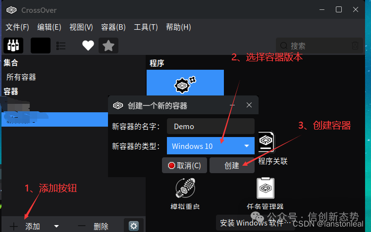 核心原理:CrossOver的核心技術(shù)基礎(chǔ)是二進制翻譯。這意味著它能夠解析和執(zhí)行Windows應(yīng)用程序(.exe文件)的二進制代碼,將這些代碼中對Windows API(應(yīng)用程序編程接口)的調(diào)用轉(zhuǎn)換為在目標操作系統(tǒng)(如Linux或macOS)上等效的系統(tǒng)調(diào)用。這種翻譯過程使得Windows程序無需修改就能在非Windows環(huán)境下運行。 這里采用自帶的CrossOver來演示,并不是所有的exe包都能安裝成功,畢竟在不同的Windows版本的系統(tǒng)上安裝exe包都有限制,Linux上使用工具安裝exe限制會更大。 在創(chuàng)建容器時有Windows 98、windows 2000、windows XP 、windows Vista 、windows 7、windows 8、windows 10版本,根據(jù)需求創(chuàng)建64或者32位的容器,小編選擇的win10容器,當然前提是準備好win10的鏡像文件。
