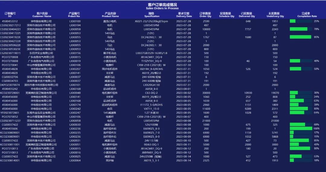 現(xiàn)在,越來越多的企業(yè)開始使用電子看板進行可視化管理。電子看板就是將企業(yè)的各種數(shù)據(jù)實時顯示在電子大屏幕上,不需要人工操作類似機場的電子屏幕,間隔一段時間會自動滾動顯示。下面介紹一些電子看板案例。 訂單執(zhí)行看板 ERP系統(tǒng)中未完成的銷售訂單的執(zhí)行情況
