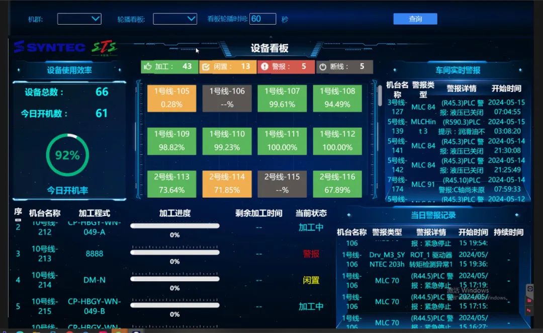 設備看板 設備開機率、設備稼動率、設備報警記錄、當前正在加工的程式。 需要在每臺設備上安裝數(shù)據(jù)采集盒,通過數(shù)據(jù)采集盒將設備數(shù)據(jù)實時讀取到數(shù)據(jù)庫,再通過看板軟件展現(xiàn)到電子看板上
